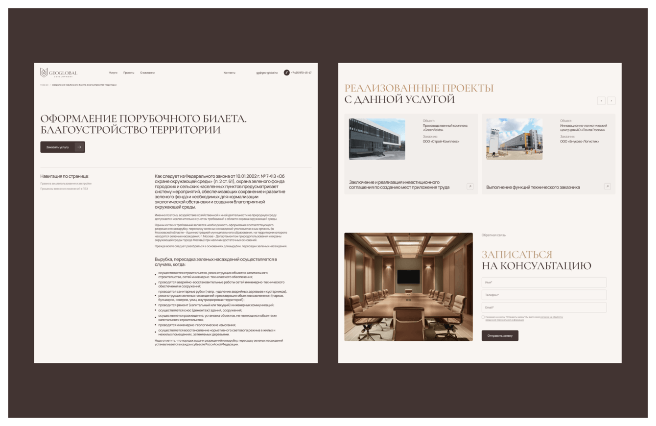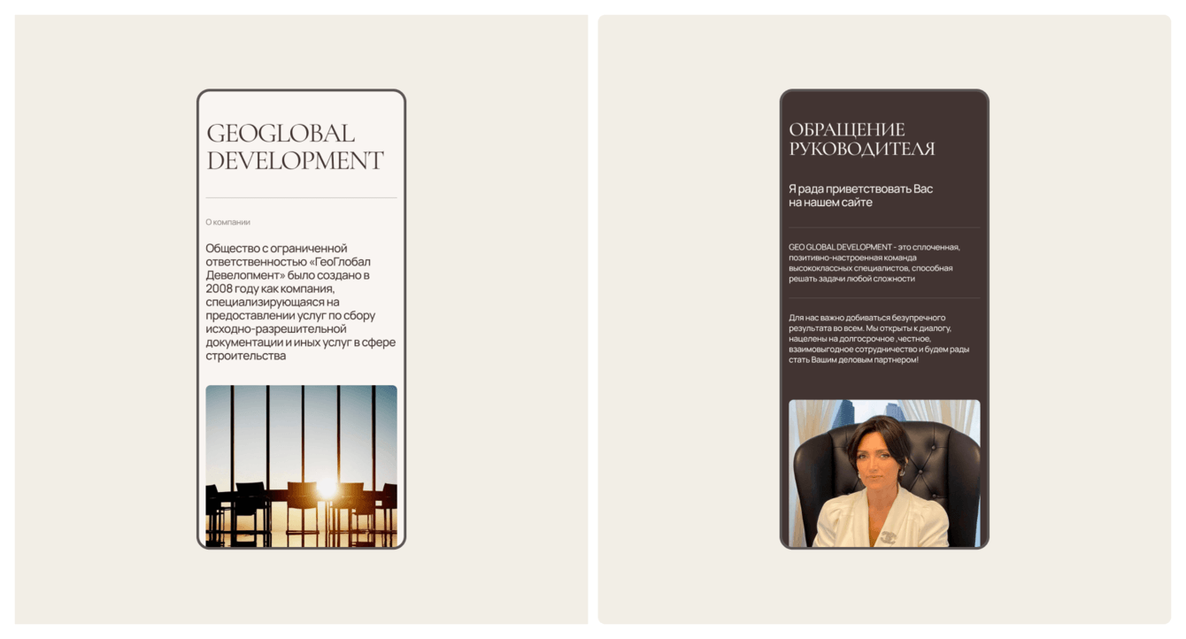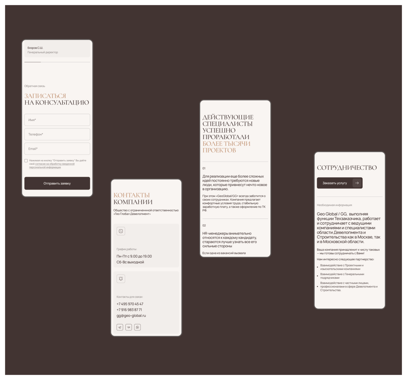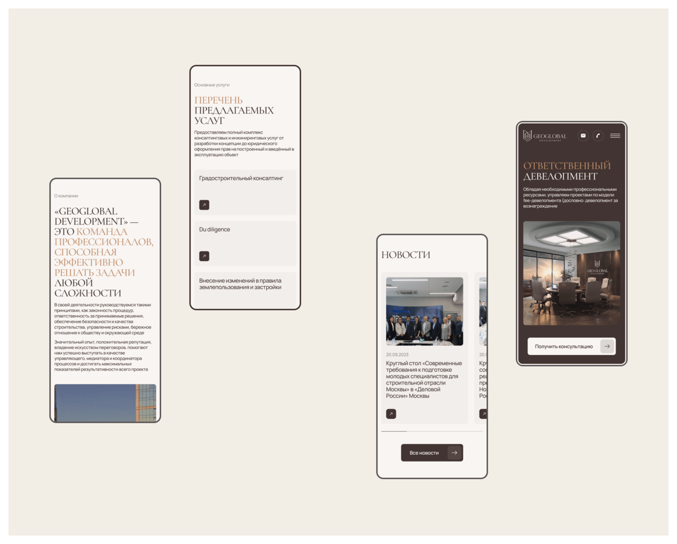 Компания GeoGlobal предоставила нам свой логотип и фирменный стиль, что стало отправной точкой для разработки концепции веб-сайта в рамках их брендбука. Мы выбрали светло-бежевый цвет в качестве основного, дополнив его акцентными тёмно-коричневым и золотым. Для заголовков секций мы использовали шрифт антиква, выполненный полностью прописными буквами, что подчеркнуло статусность и многолетний опыт компании. Этот выбор шрифта отлично сочетался с логотипом, создавая гармоничное визуальное единство.