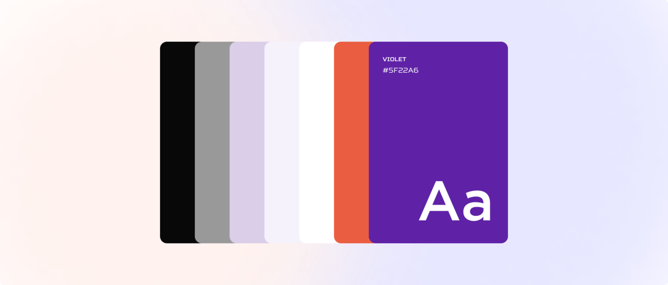 На сайте присутсвует палитра с двумя акцентными цветами: оранжевым и фиолетовым, которые используются для создания акцента