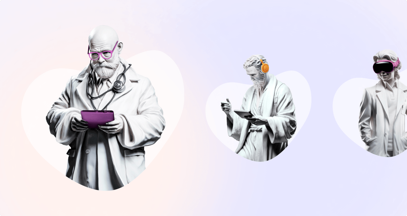 Для создания сильного визуального эффекта на главной странице были использованы образы именитых врачей, отлитых в мраморе, но с современными гаджетами