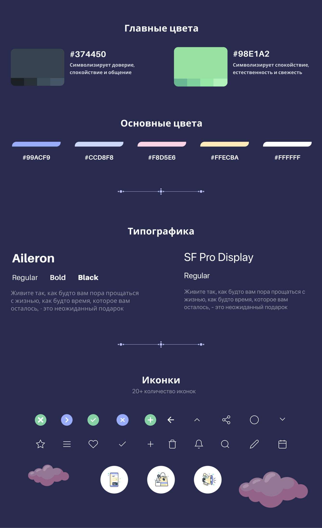 Мы выбрали светлый фон с зеленым основным акцентом и темным оттенком для контраста, обеспечивая гармоничный дизайн приложения. В качестве шрифтов: SF Pro Display для текста и Aileron для декоративных элементов, обеспечивая читаемость и стильный внешний вид.