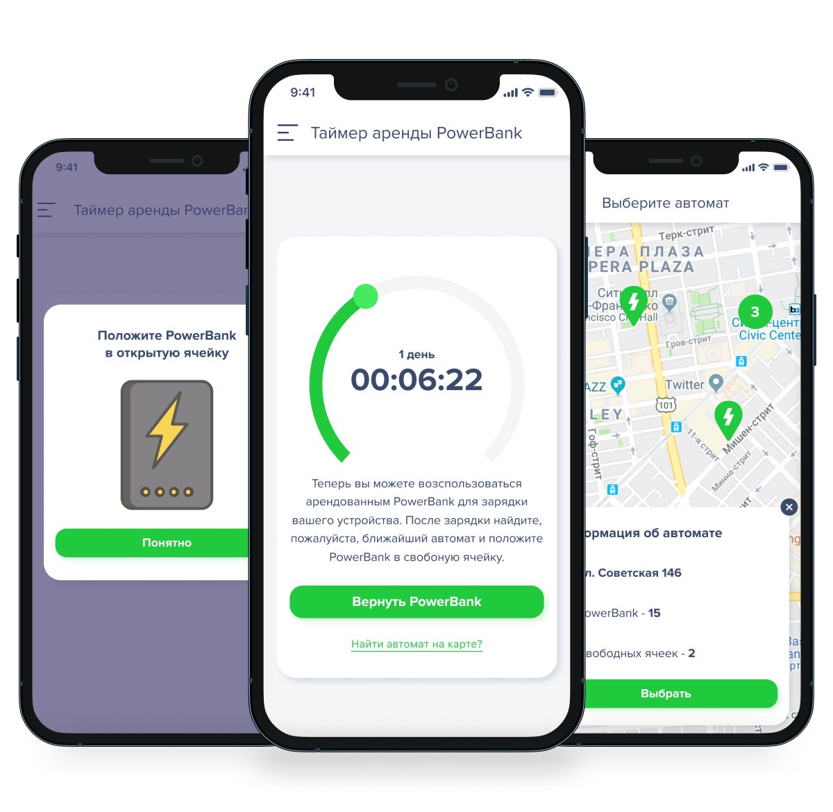 - Пользователь привязывает в приложении свою карту и может арендовать PowerBank в местах расположения автоматов;