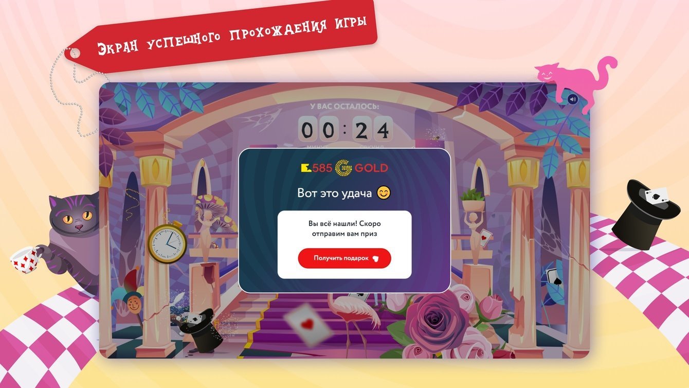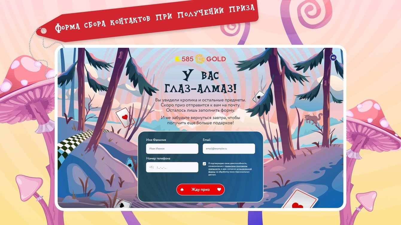 Сеть ювелирных магазинов 585GOLD предоставляет широкий выбор золотых и серебряных украшений по демократичным ценам. Перед Новым годом бренд запустил рекламную кампанию в стиле «Алисы в Стране чудес» — нам нужно было вписать в неё дизайн игры.