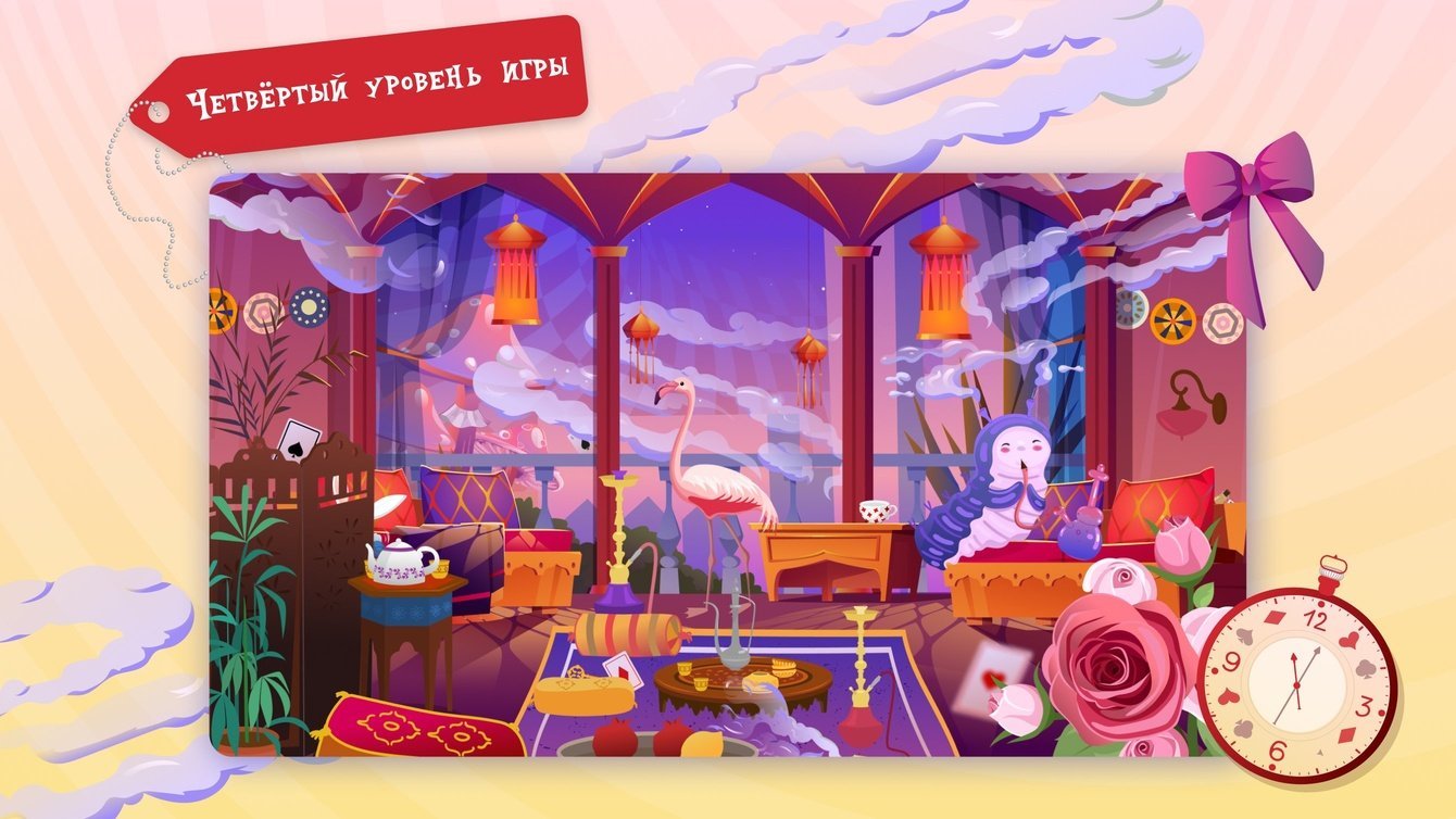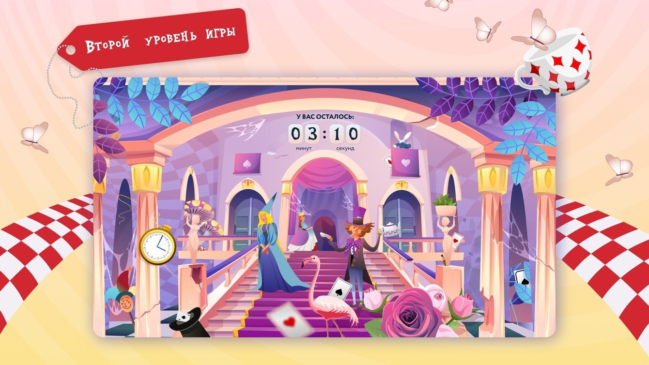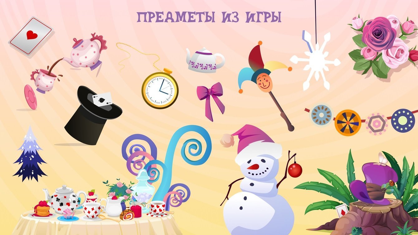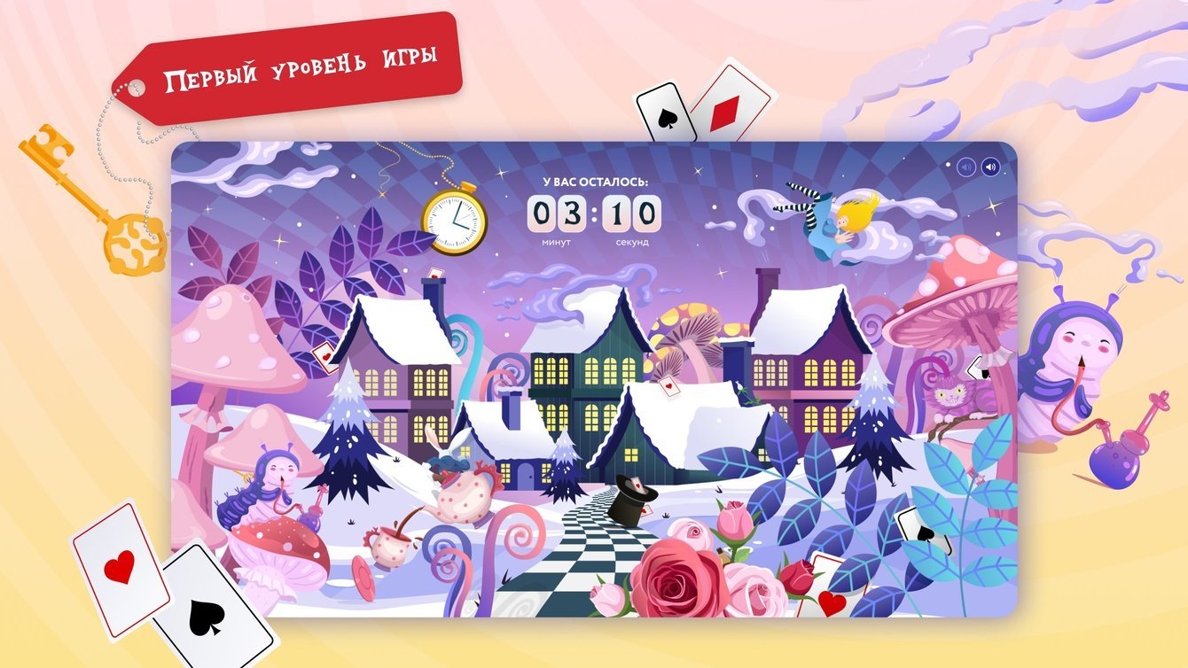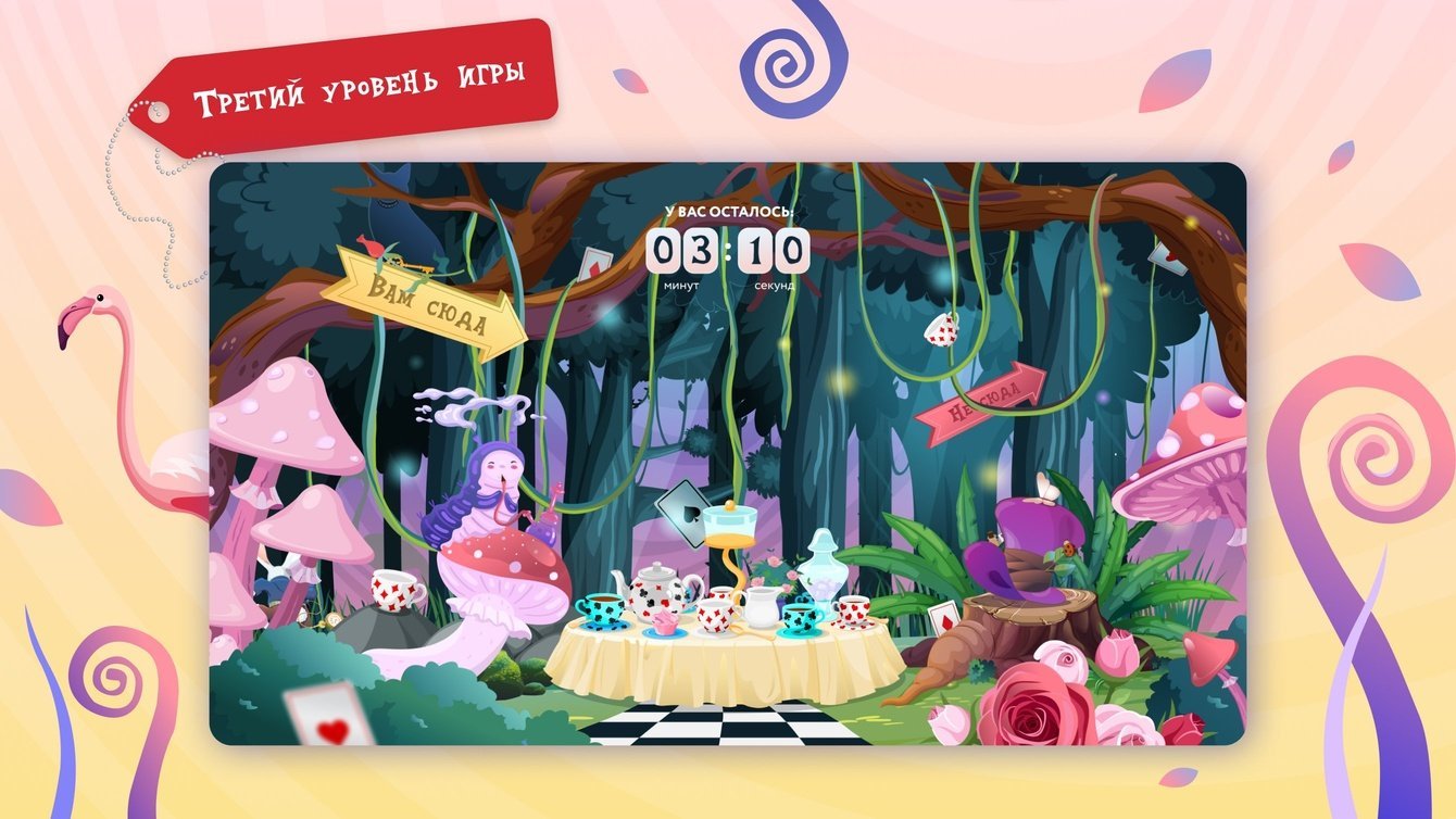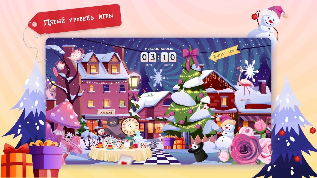 Мы разработали 5 локаций: «Лес», «Рождественская деревня», «Гостиная Гусеницы», «Королевский замок» и «Страна зимних чудес». Каждый раз, заходя в игру, пользователь попадает на одну из них и ищет три объекта: кролика, бутылочку «Выпей меня» и волшебный ключ.
