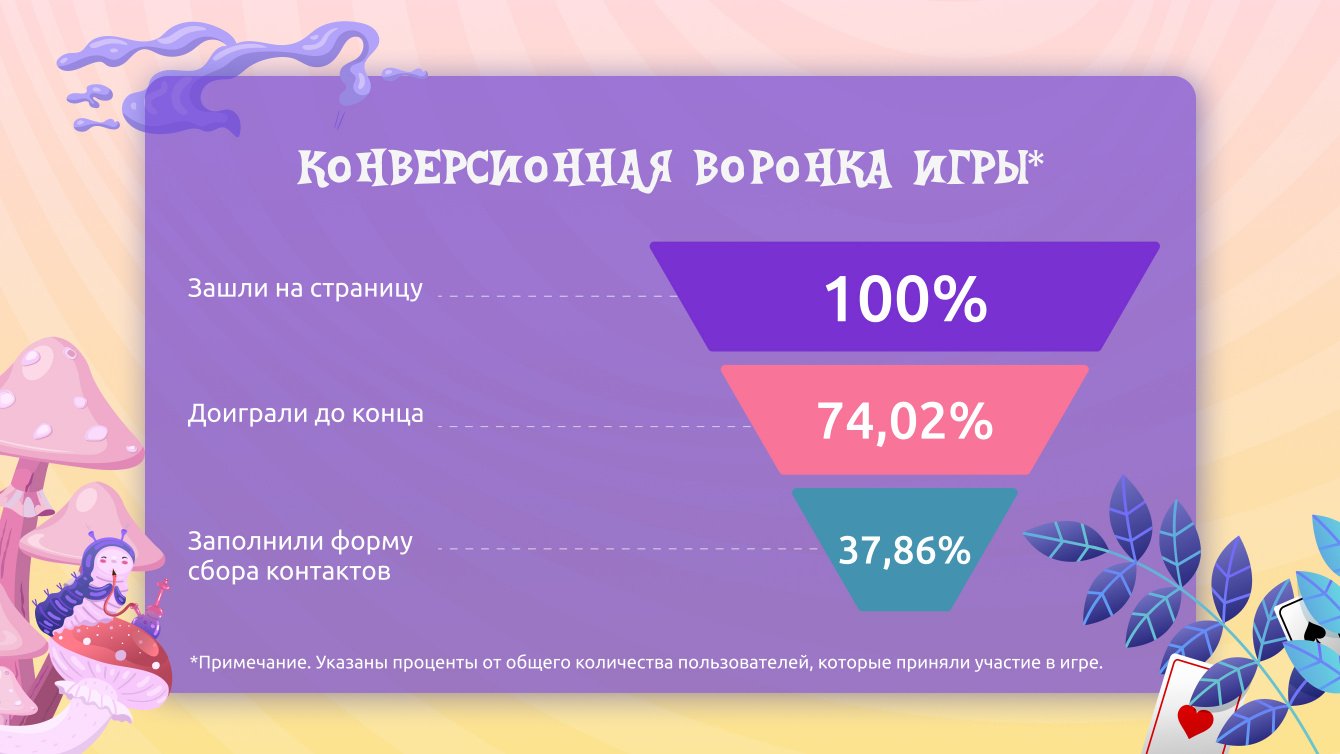 Чтобы запустить новогоднее промо и достичь поставленных целей, мы использовали креативную CRM-механику — геймификацию. Концепция игры выполнена в стилистике «Алисы в Стране чудес»: мы подобрали дизайн, соответствующий рекламной кампании клиента. Реализация проекта проходила в 4 этапа.