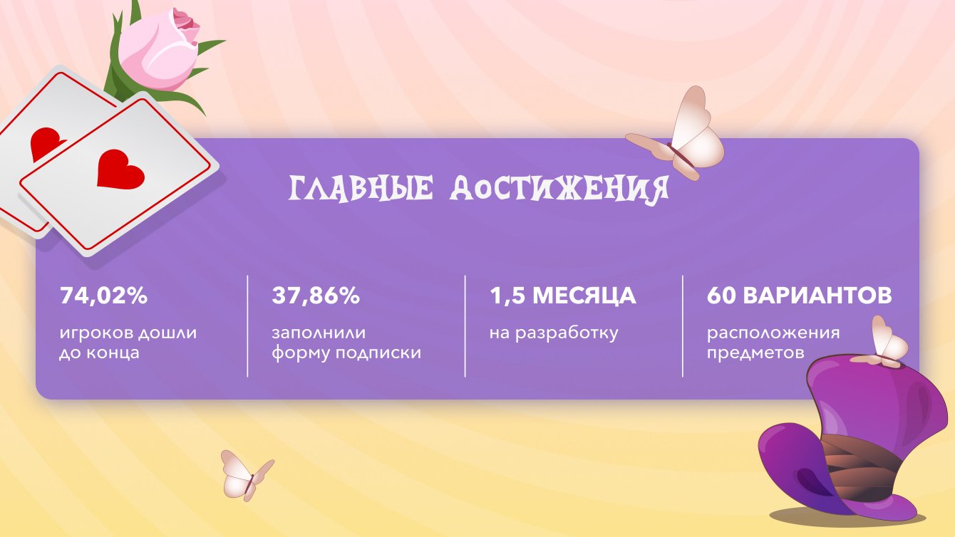Чтобы запустить новогоднее промо и достичь поставленных целей, мы использовали креативную CRM-механику — геймификацию. Концепция игры выполнена в стилистике «Алисы в Стране чудес»: мы подобрали дизайн, соответствующий рекламной кампании клиента. Реализация проекта проходила в 4 этапа.