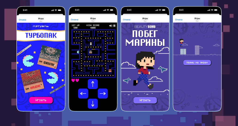 Определили, что ностальгия работает на старших поколениях, а молодёжь любит ретро-стиль и челленджи. Проверили, какие механики будут понятны для всех. Изучили рефы олдскульных игр и выбрали те, что максимально узнаваемы: Тетрис, Змейка, Mario и Pac-Man.