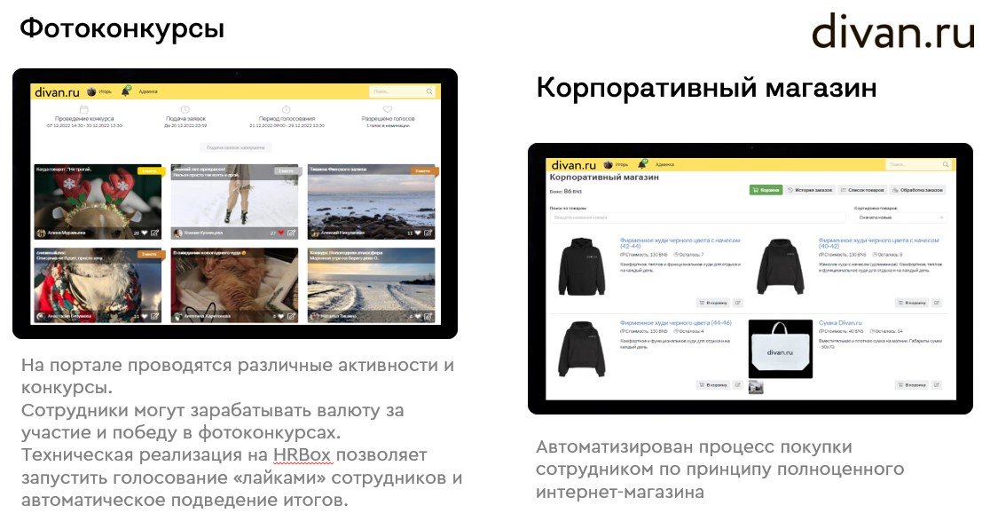Корпоративный магазин является драйвером всего процесса. Он обозначает для сотрудника конечную цель – заработать валюту и приобрести что-либо в магазине. Функционал реализован на портале и полностью автоматизирован. В магазине размещены товары (корпоративный мерч или продукция компании) и услуги (обучение, развлечения, абонементы и т.д.).
