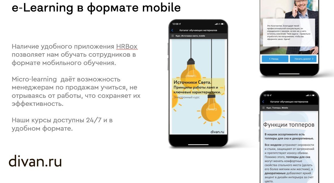 Обучающие материалы доступны на смартфоне. Также при помощи гаджета можно узнавать новости компании и участвовать в обучающих мероприятиях. Мы развиваем mobile learning и адаптируем обучающие материалы для удобно использования на смартфоне.