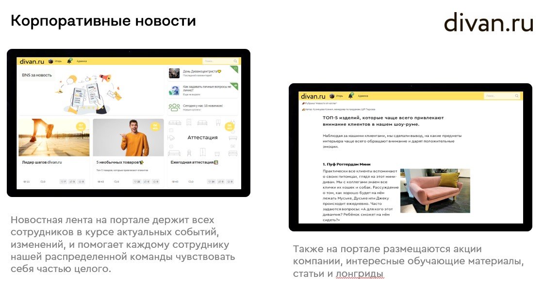 На платформе сотрудники могут узнавать о мероприятиях и корпоративных новостях, также там размещаются акции компании, интересные обучающие материалы, статьи и лонгриды. Важно, что у нас много внутренних целевых аудиторий, и мы двумя кликами ограничиваем видимость любого контента только на заинтересованных людей, тем самым сокращая поток ненужной информации.