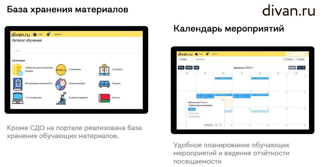 На портале реализована система дистанционного обучения, которая полностью автоматизирована как для пользователя, так и для менеджеров по обучению. Наши сотрудники обучаются при помощи электронных курсов, диалоговых тренажеров и вебинаров, а также сдают тесты и аттестации прямо на портале. Благодаря системе мы научились обучать территориально распределенную команду дистанционно, добились максимального охвата обучением и повышения вовлеченности в процессы. Кроме СДО на портале реализована база хранения обучающих материалов. Для любой целевой аудитории можно собрать свои треки и сделать автоназначения.