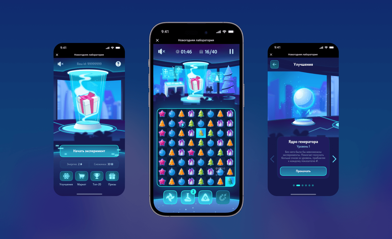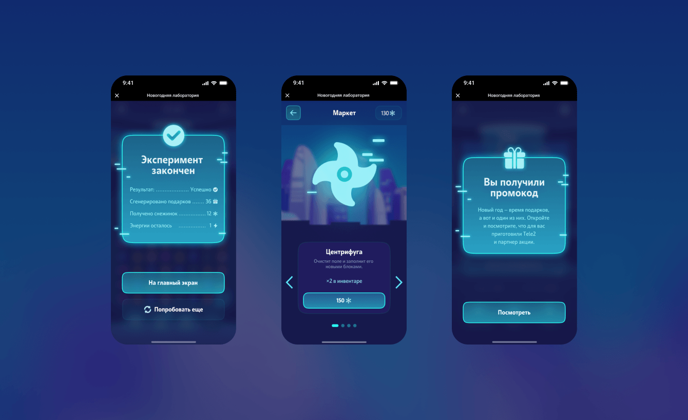 Игра в стиле sci-fi «Новогодняя лаборатория». Пользователям предлагалось выполнять задания, получать за них бонусы и тратить их на апгрейд виртуальной лаборатории. Конечная цель игры – прокачать свою игровую локацию и вывести формулу идеального новогоднего подарка.