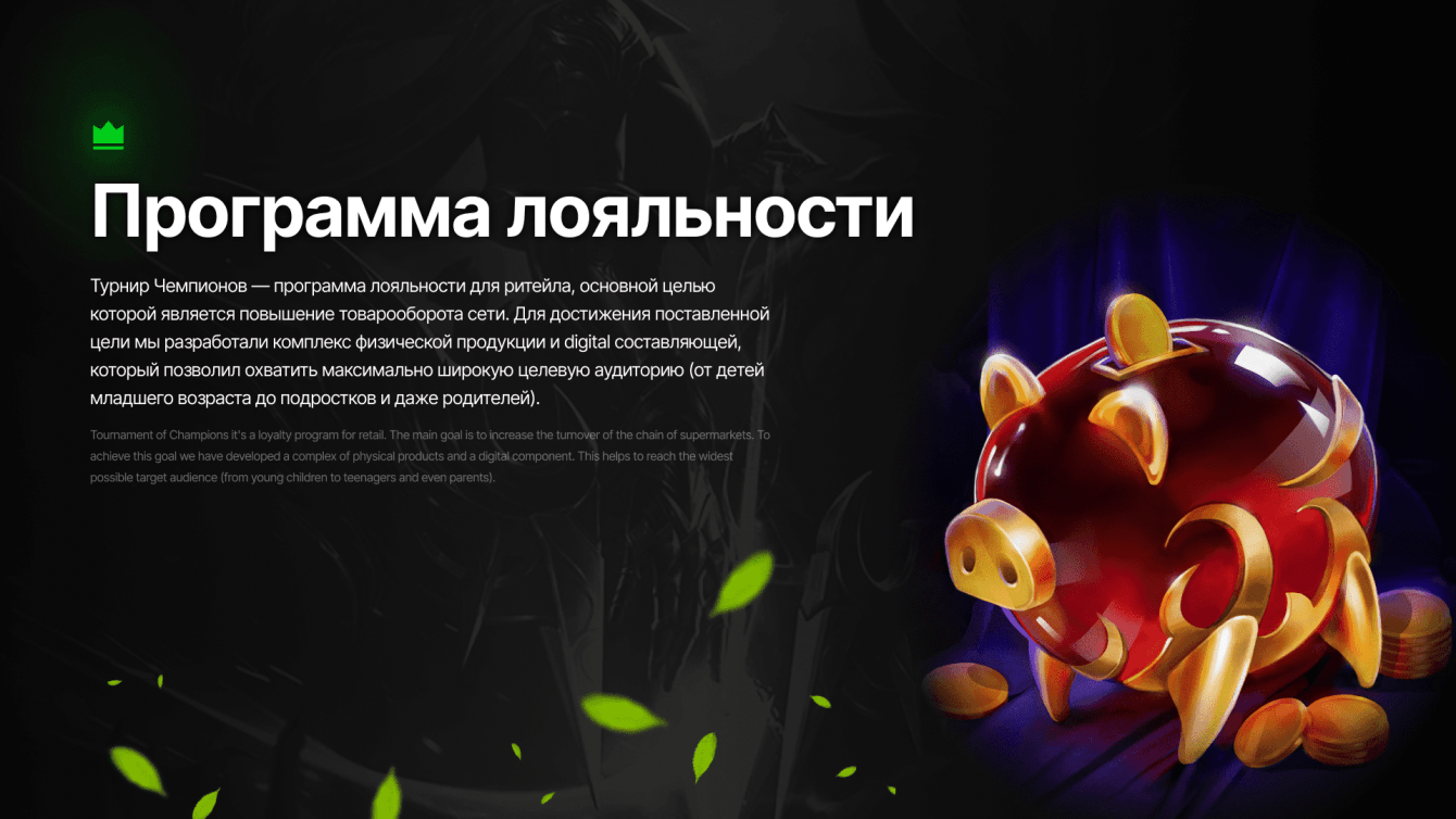 В данной программе лояльности мы совместили карточные игры, персонажей и дополненную реальность. Пользователь не просто собирает коллекцию, но и использует чемпионов и артефакты в сражения с командами противников.