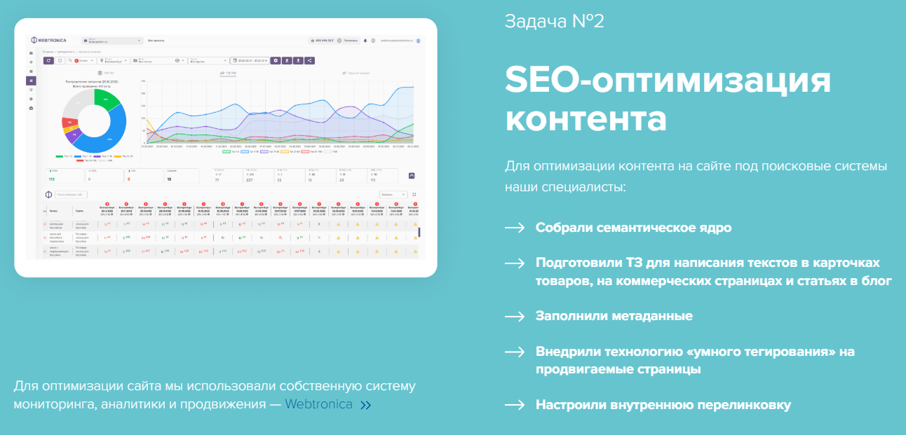 Команда Webtronics проанализировала специфику отрасли, оценила основных конкурентов по 250+ коммерческим факторам, провела технический аудит сайта. В результате анализа был составлен комплексный план работ, состоящий из нескольких задач: