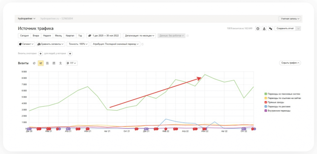 Заказчик ООО «Гидропартнер» обратился с задачей увеличить трафик на сайте компании. Цель — повысить продажи товаров и услуг, ассортимент которых насчитывает больше 150 000 позиций.