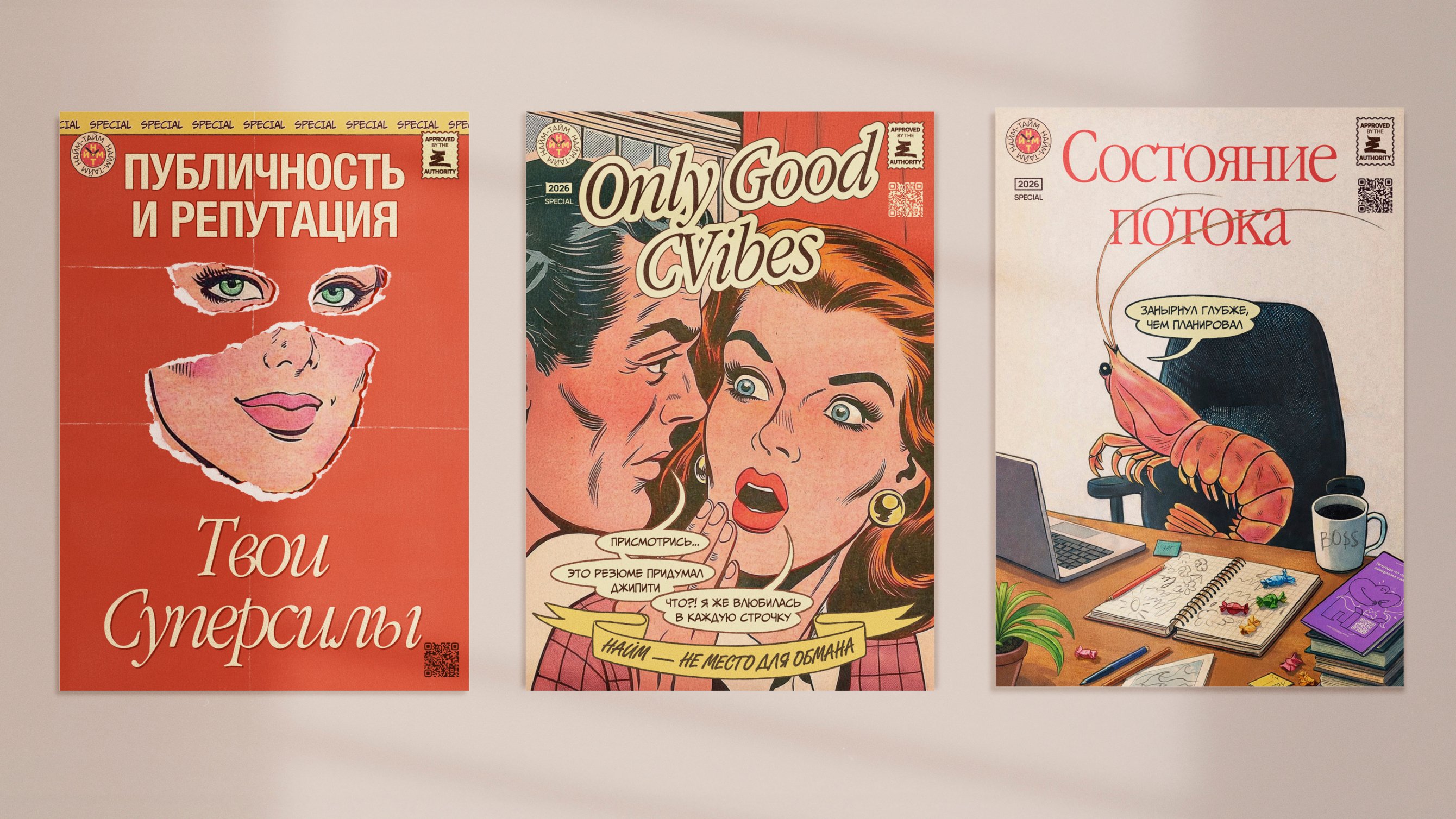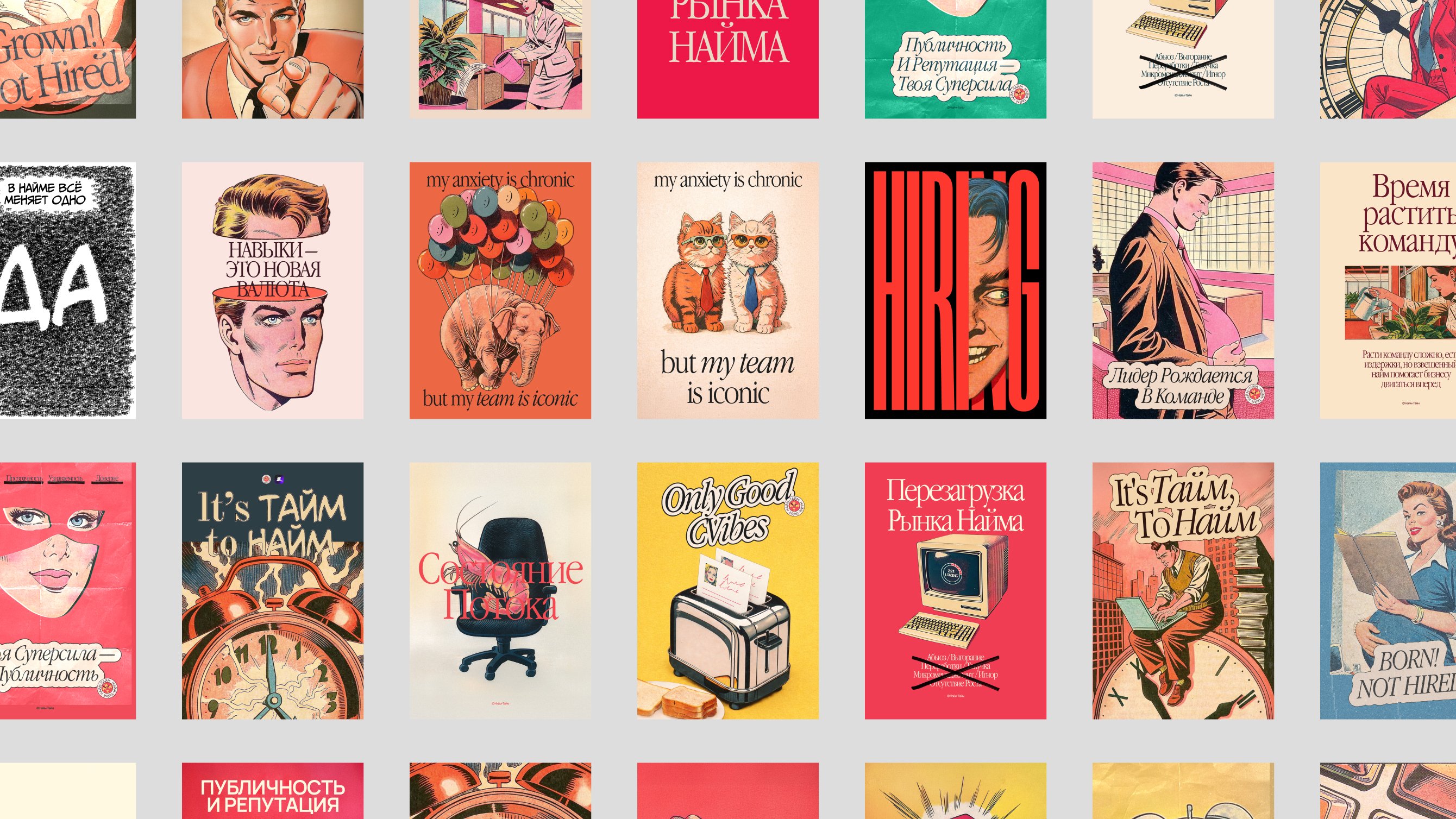 Пробовали обыграть реальные проблемы рынка: нехватку кандидатов, недостаток публичности, засилие ИИ. Смотрели, считывается ли смысл, уместен ли постер в рабочем пространстве, хочется ли повесить его на стену и разглядывать. Часть сильных концептов отсеяли — они не решали задачу.