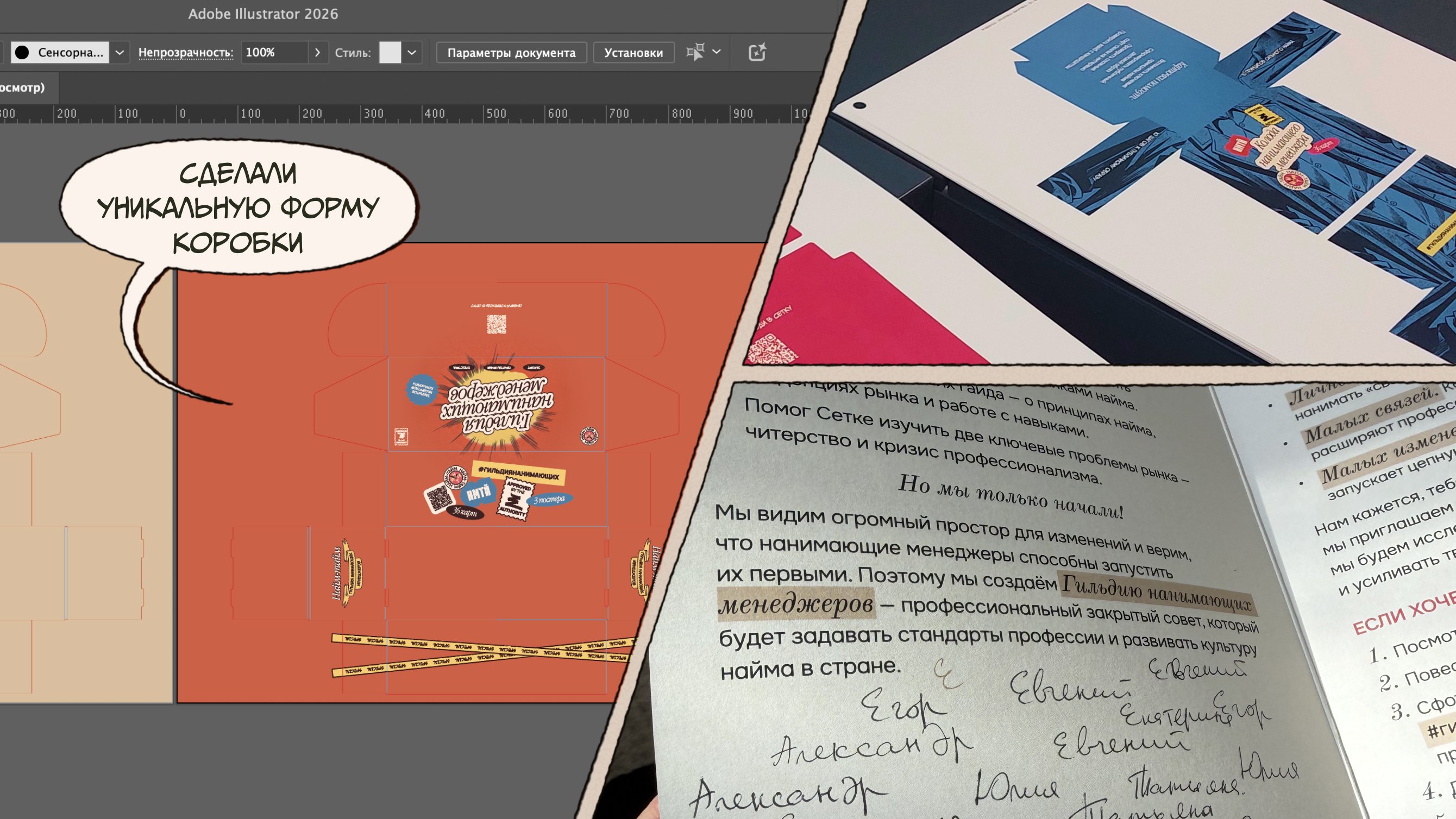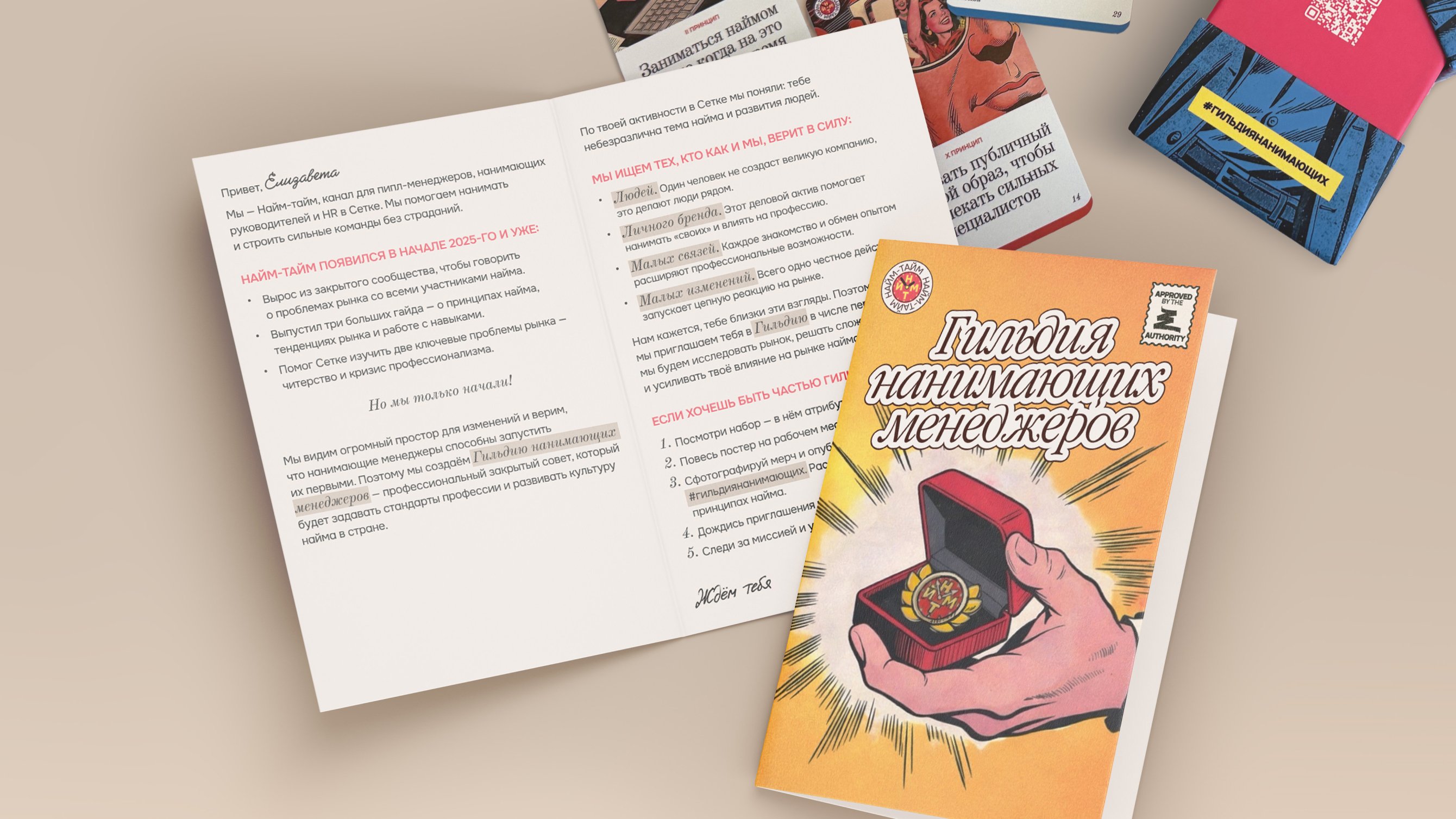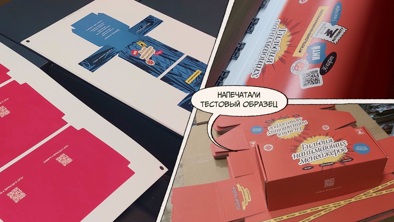 Понимая, что цифровой контент теряется в инфопотоке и на фоне ИИ, мы искали формат, который останется в руках и памяти участников. Хотели сразу дать ценность, создать причину принять наш вызов и посвятить свое время работе Гильдии. Понимали, что его могут отклонить, но физический набор сразу привязывал к инициативе и выводил наш канал за пределы Сетки — в офисы, переговорки и на рабочие места нанимающих.