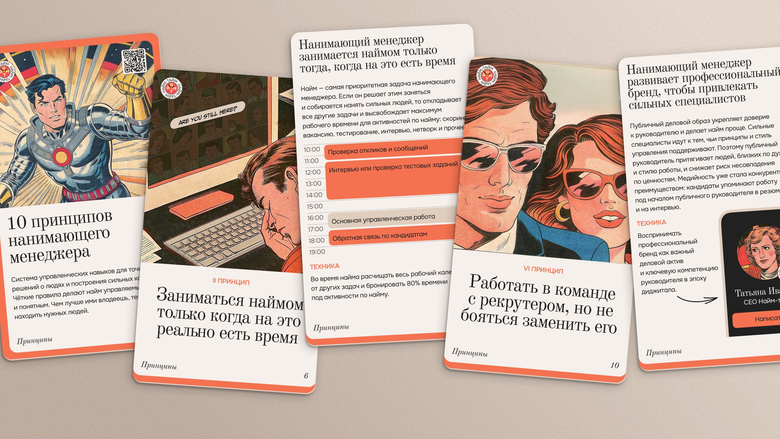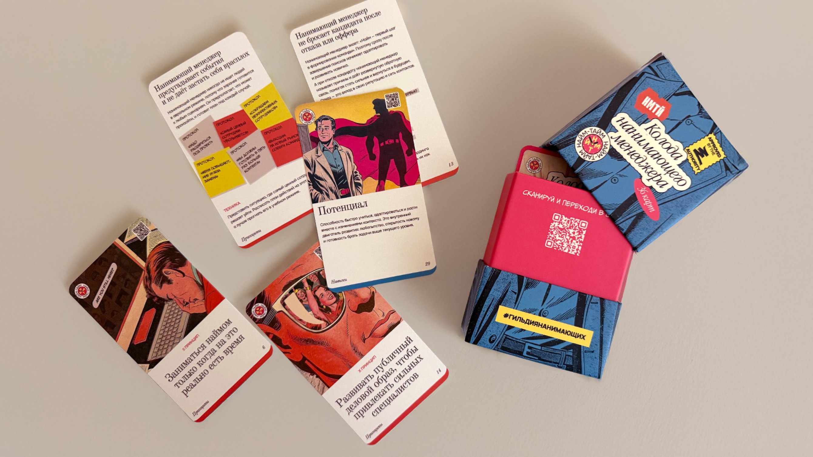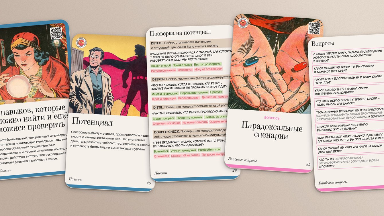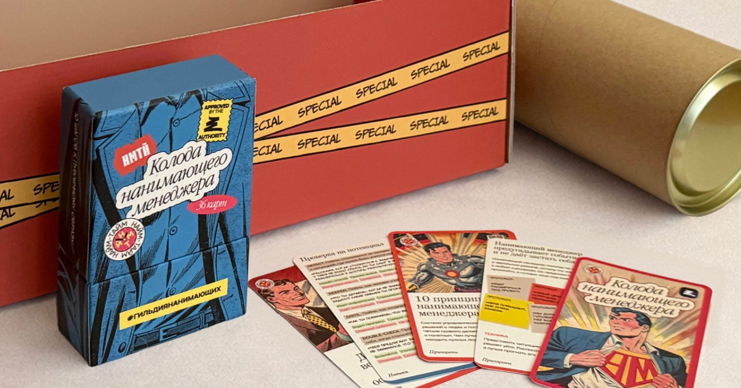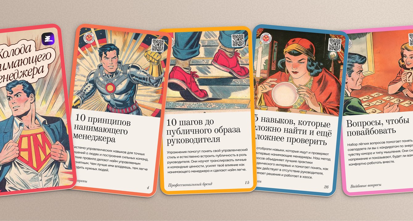 – Колоду карт с принципами найма, шагами развития публичности, вопросами для оценки навыков и проверки вайба на интервью.