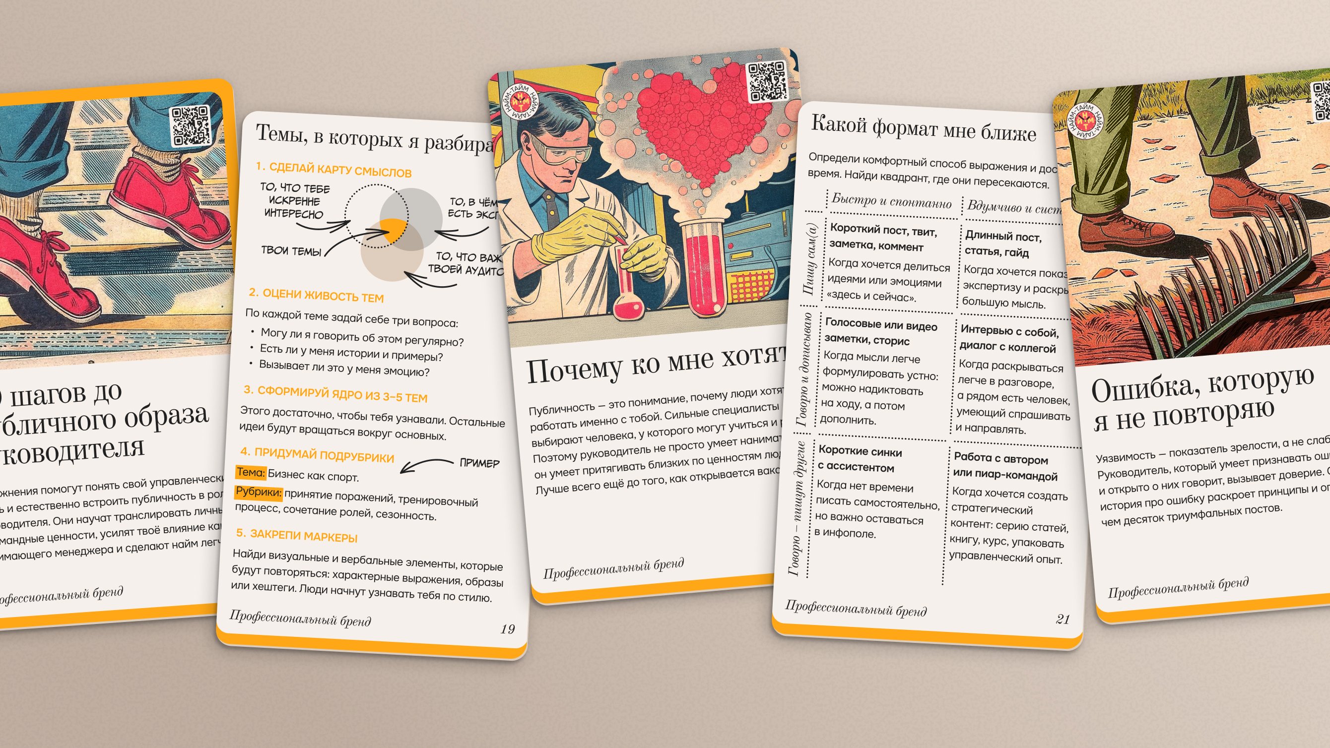 Колода карт — основной инструмент набора. Она хранит знания и превращает в прикладной инструмент. Карту можно достать на встрече или в момент раздумий и сразу применить. Это быстрее и удобнее, чем гайды и инструкции.