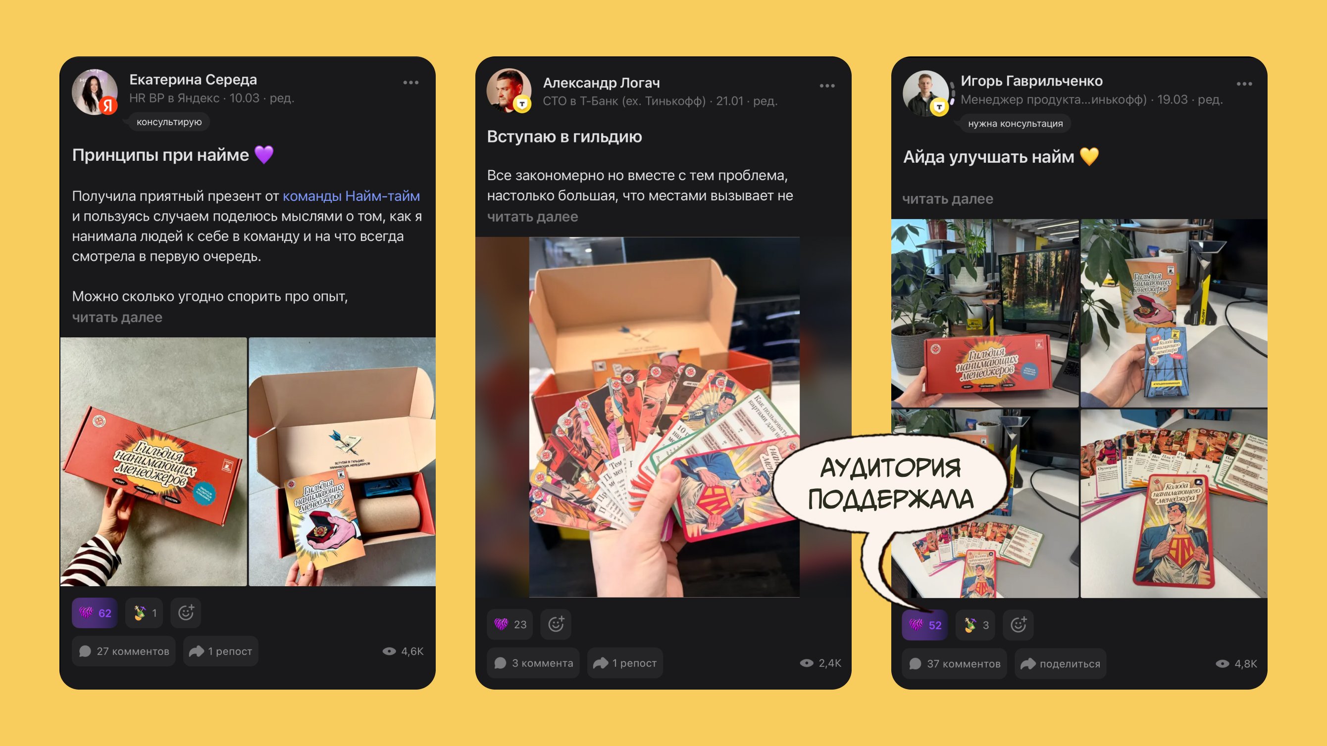 Мы отправили боксы 10 нанимающим менеджерам из Сетки и предложили рассказать о них в профилях. Участники опубликовали посты, включились в обсуждения и стали ядром Гильдии. Через их контент мы привлекли внимание аудитории и собрали экспертное сообщество.
