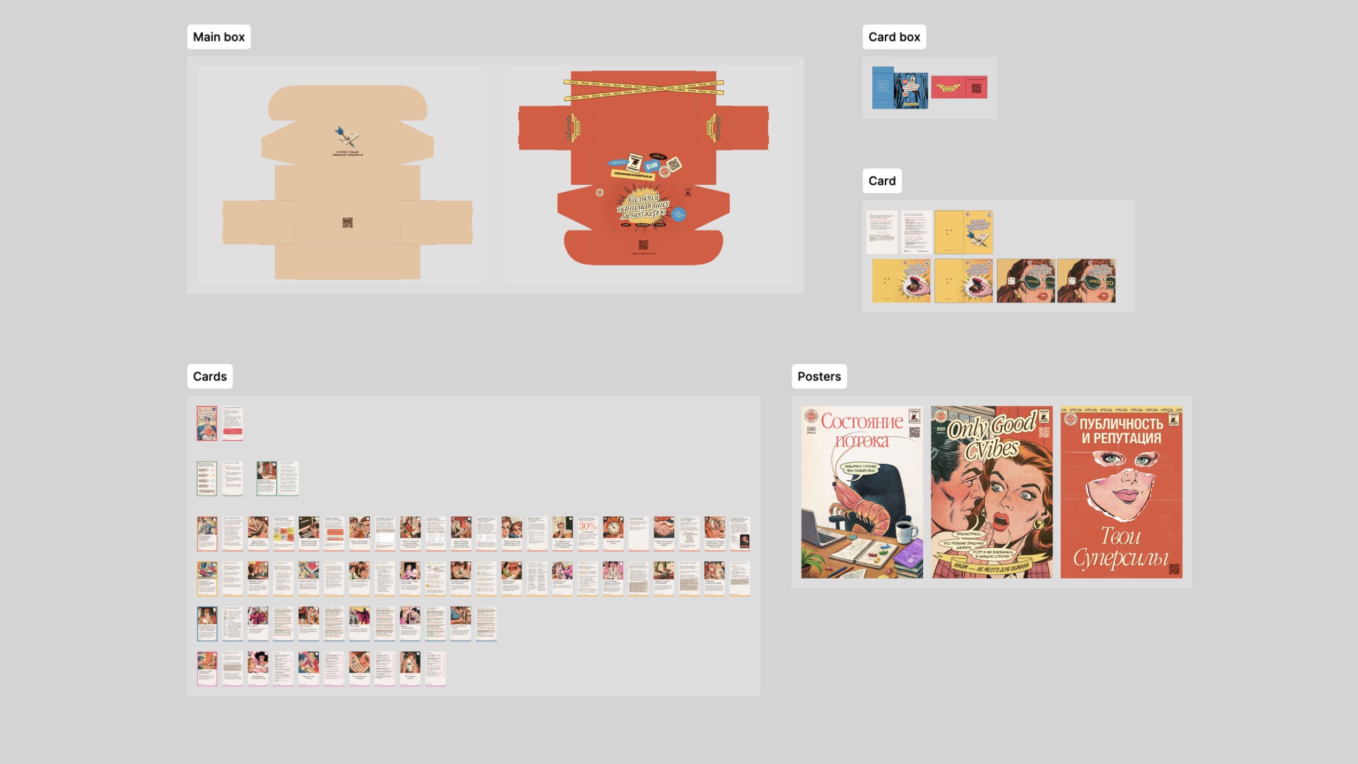 Чтобы упаковать все атрибуты, пришлось делать собственную коробку. Готовые решения не подходили: в них не помещались тубусы с А3-постерами, колода и открытка в нужной конфигурации. Поэтому мы разработали свою развертку и оформили её в общем визуальном стиле набора.