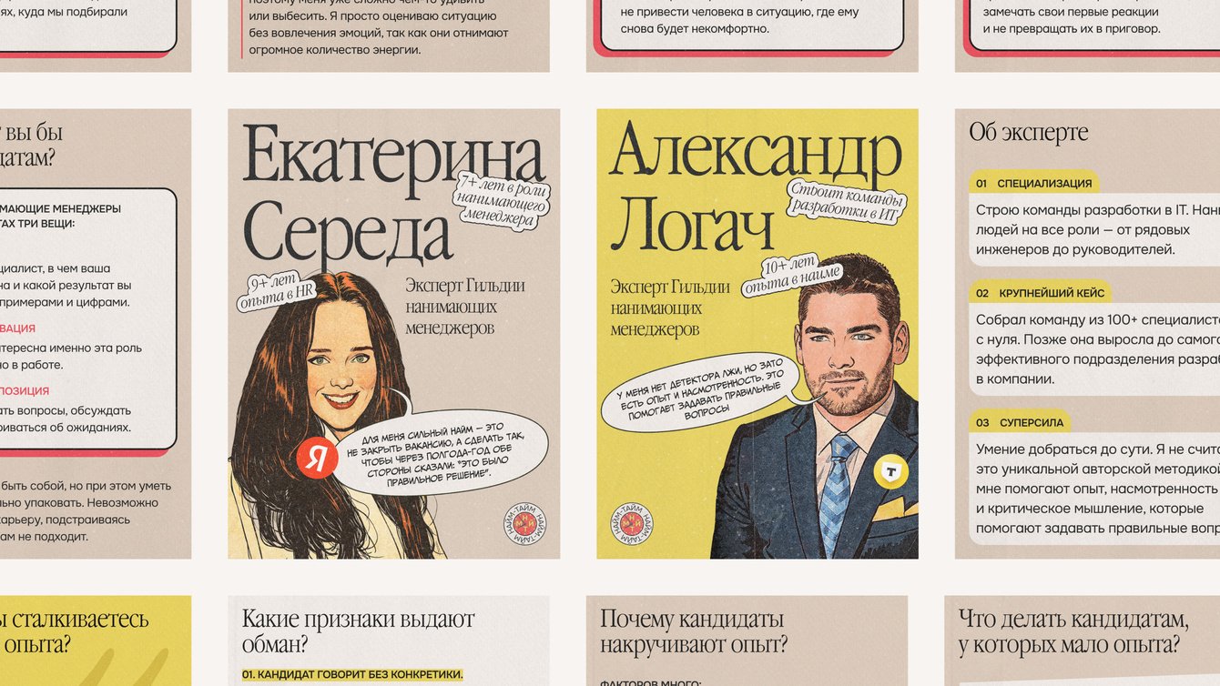 На этой базе мы сформулировали концепцию закрытого экспертного совета. По нашей задумке участники Гильдии разбирали бы другие реальные проблемы рынка, делились личными практиками и предлагали решения, которые можно сразу внедрить в работе. «Найм-тайм» собирал этот опыт и делал доступным для всех сторон найма: нанимающих, эйчаров и соискателей.