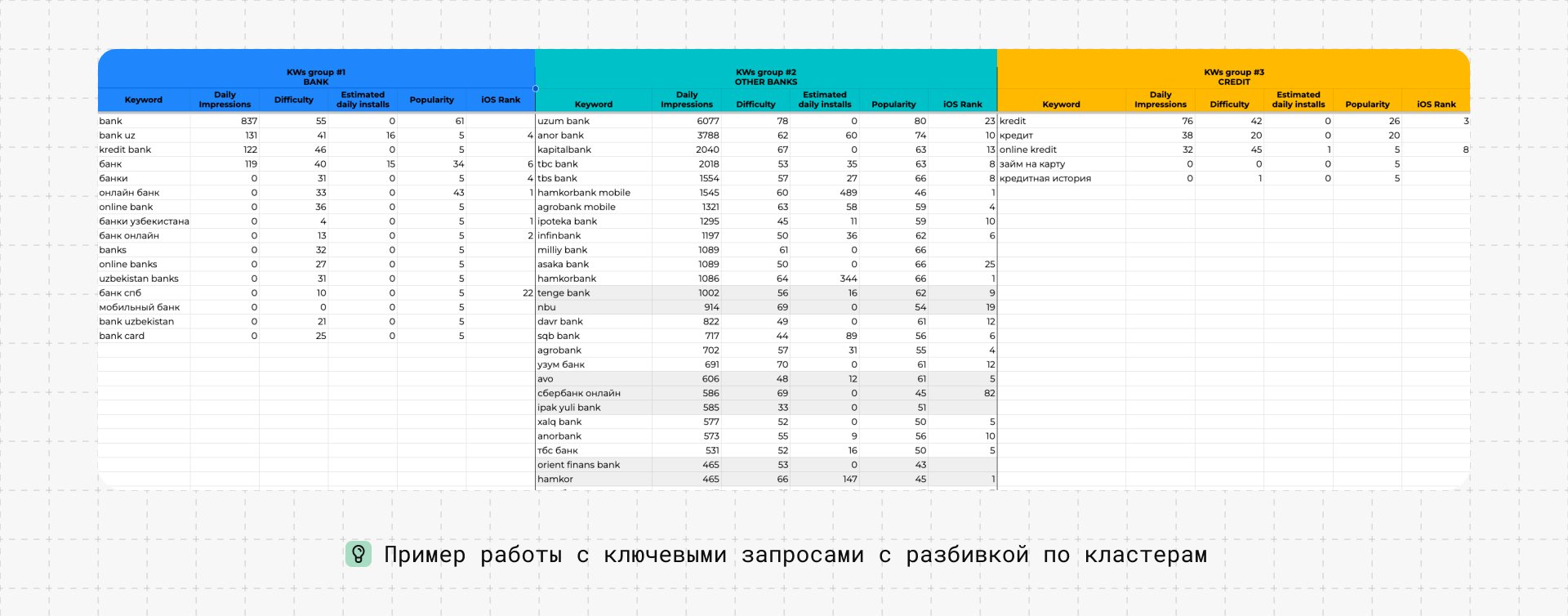 Одно из базовых направлений ASO — работа с семантикой. Мы собрали ключевые слова и фразы, по которым пользователи ищут банковские приложения, распределили их по кластерам и на этой основе выстроили текстовую оптимизацию. Дальше эту семантику регулярно обновляли: расширяли список запросов, уточняли формулировки и следили за тем, как меняется спрос.