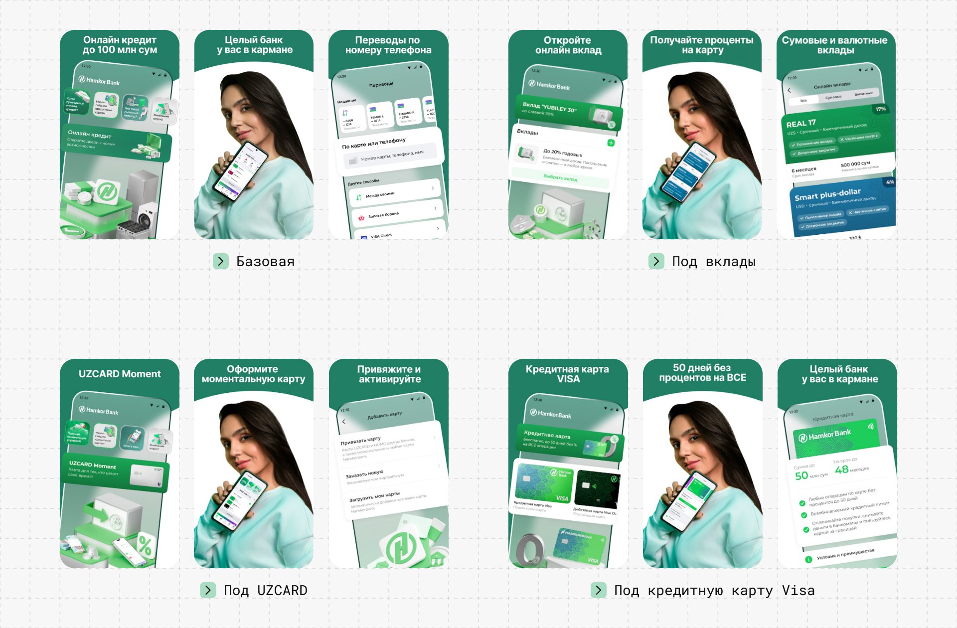 В Google Play мы использовали другой инструмент визуальной оптимизации — кастомные страницы. Для них прорабатывали отдельные сценарии входа. Например, если пользователь искал вклады, он попадал не на общий экран приложения, а на страницу с релевантным предложением и понятной ценностью.