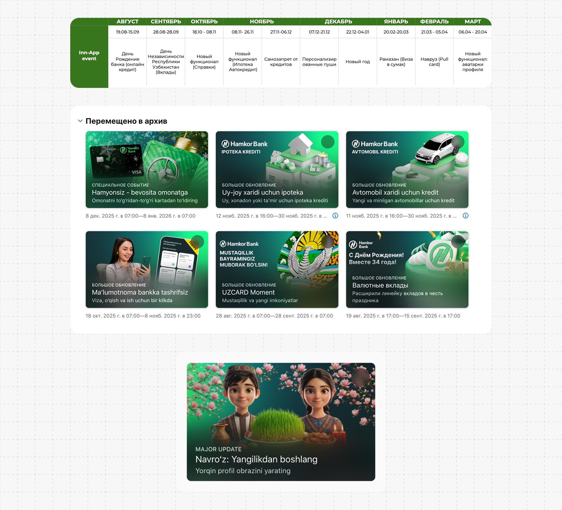 Регулярные события в приложении тоже стали частью стратегии. В течение года мы запускали In-App Events не только для продуктовых обновлений — вкладов или кредитных карт, — но и приурочивали их к важным датам.