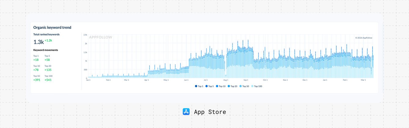 ✓ App Store. После обновления текстовых метаданных количество индексируемых ключевых запросов выросло на 1350% — с 88 до 1275 в день.
