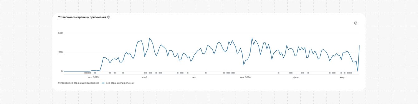 ✓ С 1 октября 2025 года по март 2026 года кастомные страницы принесли приложению дополнительные 39 тысяч установок. Конверсия в установку составила 65%.