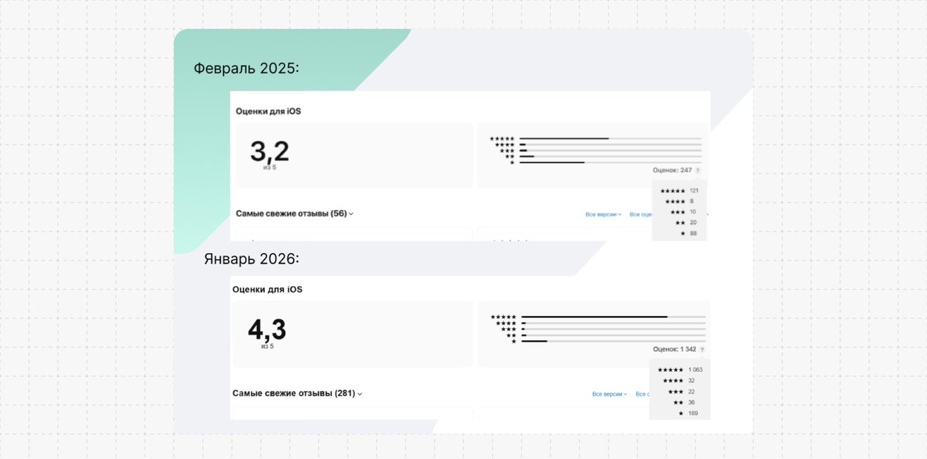 ✓ рейтинг приложения вырос с 3,2 до 4,3 в App Store и с 3,5 до 4,4 в Google Play.