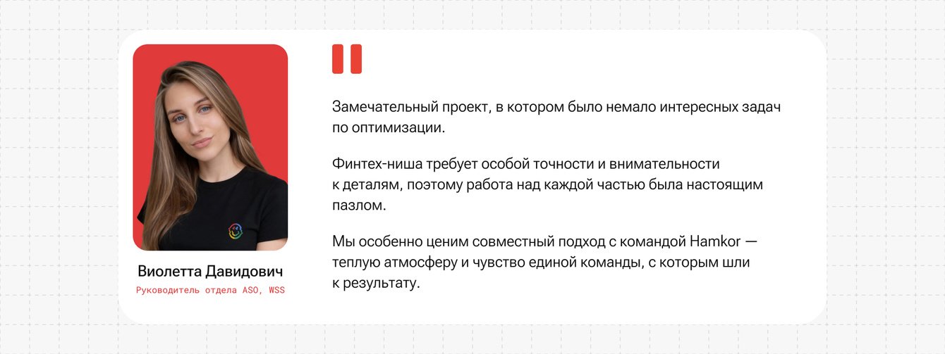 С Hamkorbank работа получилась динамичной и продуктивной. Команда банка действительно вовлечена: активно участвует в разработке дизайна, видит ценность работы с репутацией, быстро устраняет баги и внедряет улучшения. Мы вместе отмечаем рост органики и развитие приложения. Такой подход делает процесс легким и слаженным. Приятно работать, когда клиент не просто ждет результат, а становится частью оптимизации.