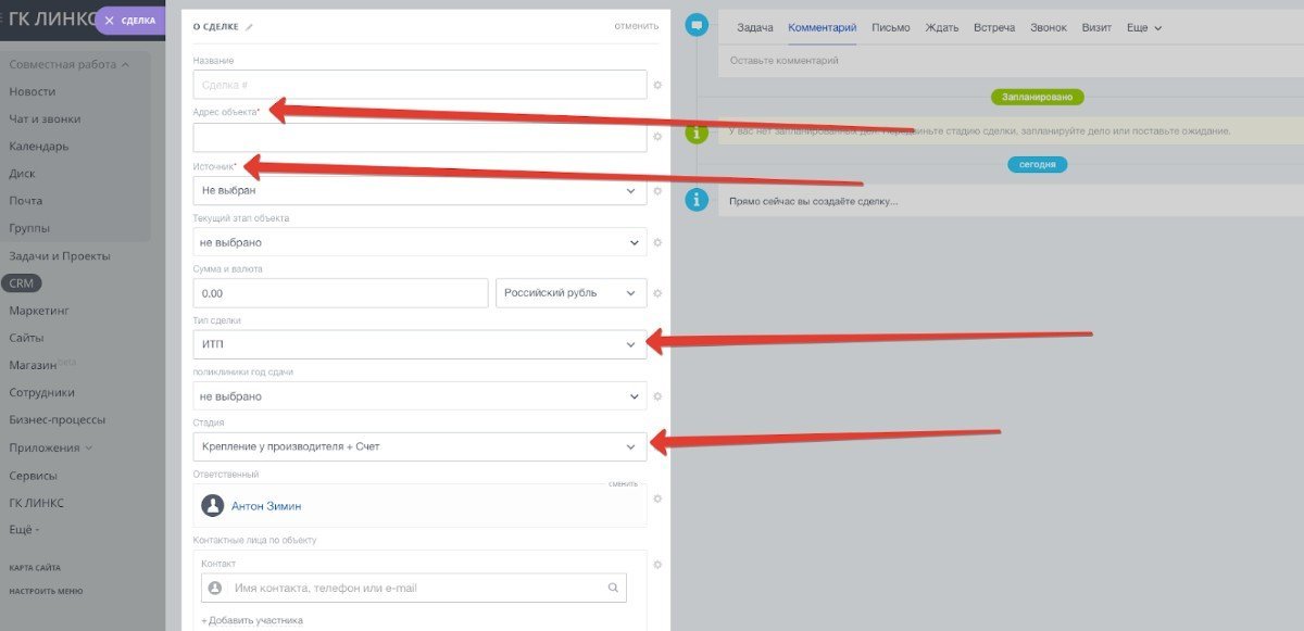 В карточке сделки были добавлены нестандартные поля, необходимые компании ГК Линкс, для сбора всей важной для проекта информации.