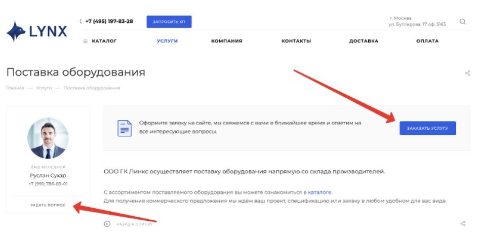 2. Оставили связь с отделом продаж на страницах сайта, что позволяет клиенту всегда видеть контактные данные менеджера перед глазами и при возникновении вопроса, его задать.