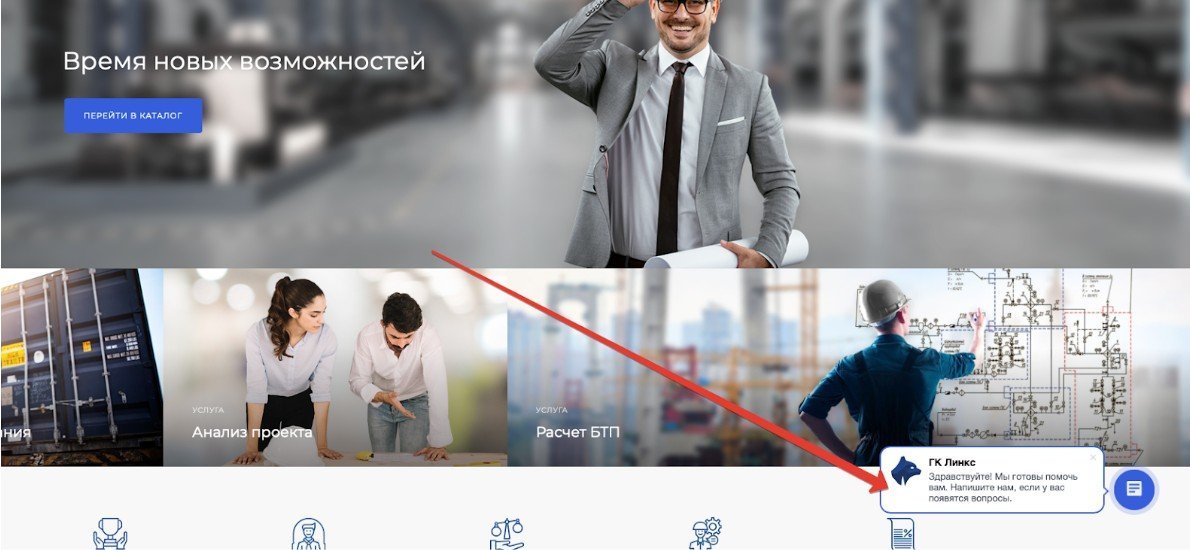 4. Настроили онлайн чат Б24 на сайте, чтобы клиент имел возможность в режиме реально времени пообщаться с менеджерами компании ГК Линкс. Чат всегда активен и свободные сотрудники могут отвечать на вопросы максимально оперативно.