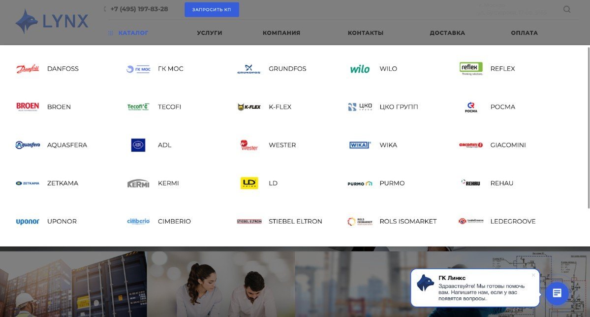 Еще до начала создания сайта, на этапе агрегации требований по проекту мы выяснили, что бизнес-процесс покупки товара у компании ГК Линкс не такой как в интернет-магазине или интернет-каталоге – всегда есть процесс консультирования менеджерами компании и, фактически, клиенты выбирают направления и/или бренд, а уже менеджеры компании делают спецификации с конкретными товарами.