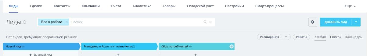 В воронку лидов приходят все заявки с сайта, мессенджеров, телефонии. Автоматически (по настроенным триггерам и роботам в воронках) назначается менеджер и проходит квалификация лида, для того чтобы, в первую очередь, работу попадали наиболее «интересные» лиды. На стадии лидов происходит процесс «догрева».