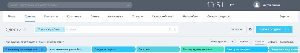 Максимально готовые к заключению контракта лиды, переходят на воронку сделок, где также есть определенные стадии продаж. Вся информация, полученная в ходе взаимодействия с лидом переносится в сделку.