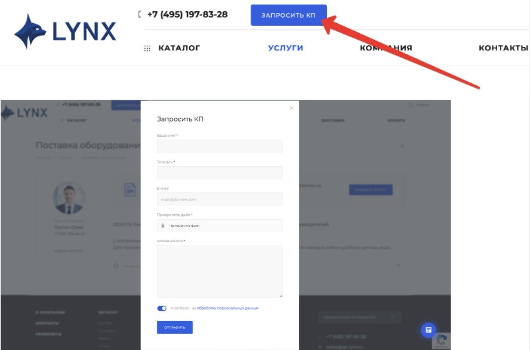 4. Нестандартная форма, которая была разработана нами по заказу клиента - это форма «Запросить КП». Форма была выполнена в сочетании с выбранной дизайн-концепцией на сайте: