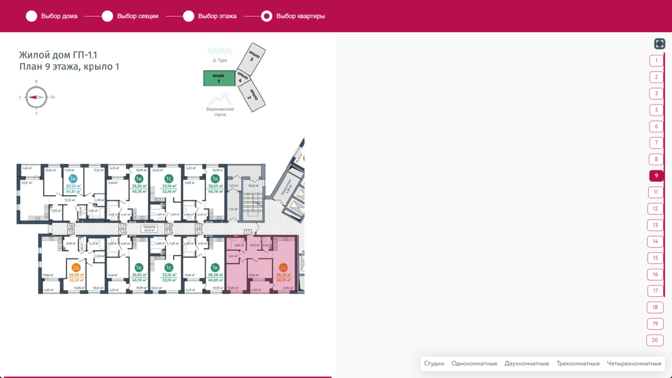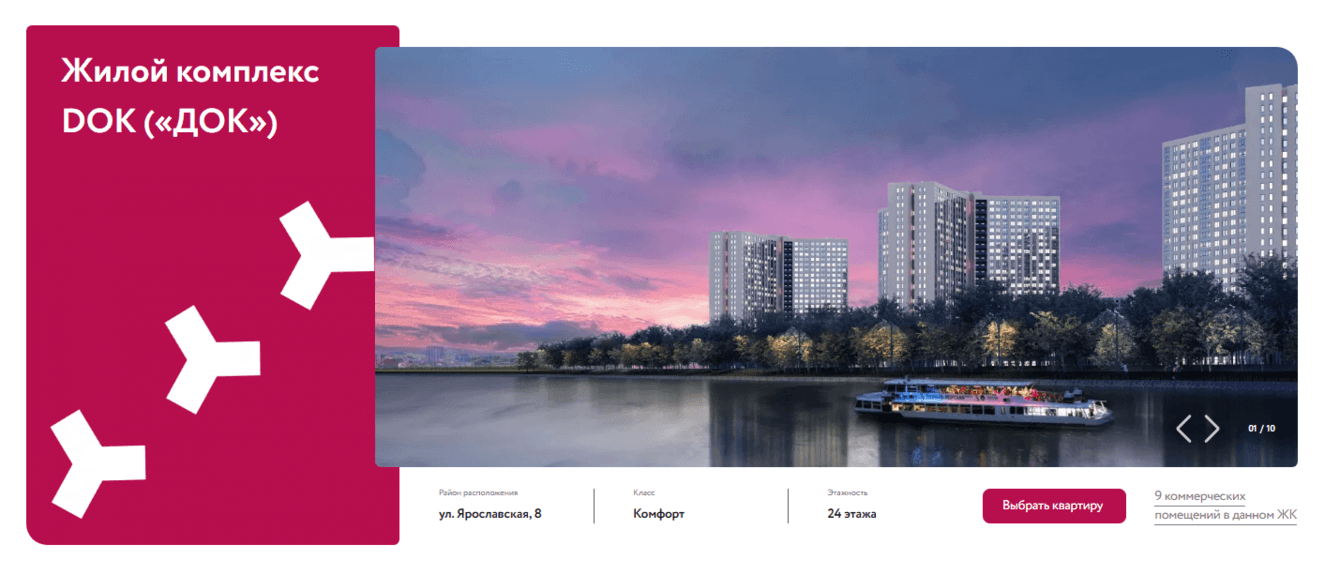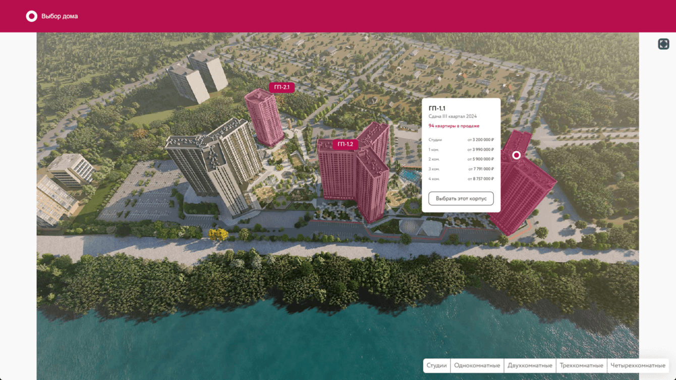 С его помощью клиент может выбрать квартиру сразу в том комплексе, который ему понравился. Покупатель видит, как расположены дома относительно инфраструктуры, может виртуально пройтись, выбрать интересующий дом, секцию, этаж, посмотреть все квартиры в наличии. Каждый элемент в подборщике кликабельный, что вовлекает пользователей в процесс выбора квартиры.