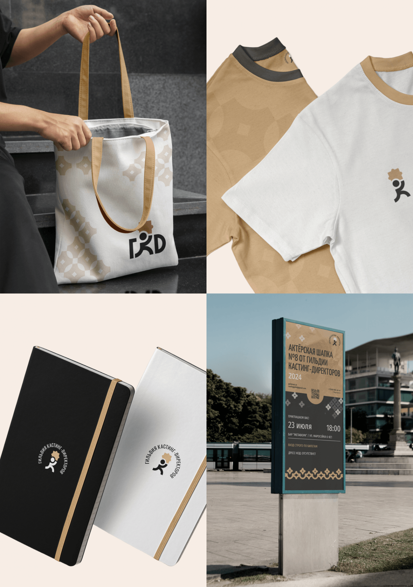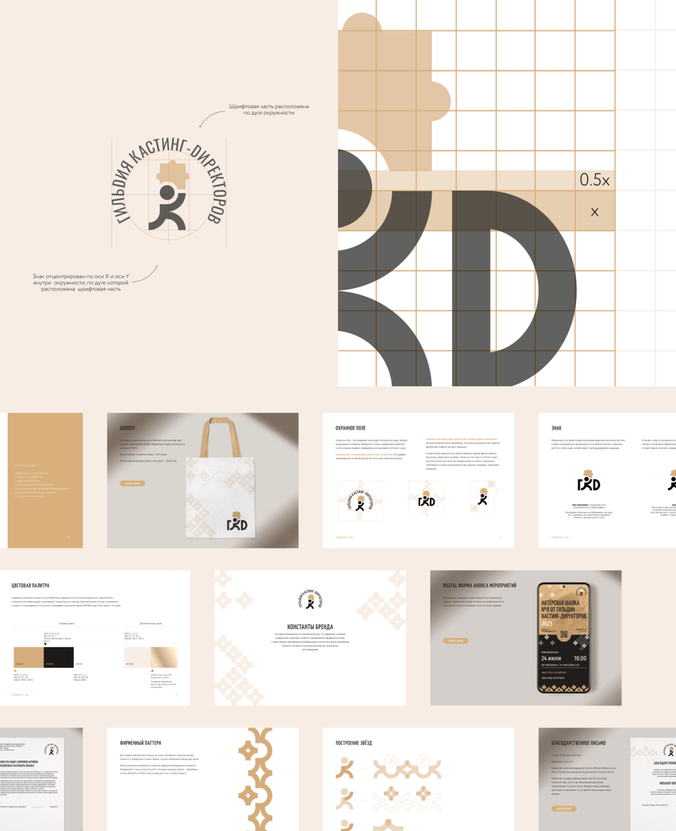 Фирменный стиль для Гильдии кастинг-директоров России был разработан с учетом профессиональной специфики организации. Основой стало схематичное изображение, символизирующее миссию кастинг-директоров — находить таланты. Логотип выполнен в виде фигуры, несущей кусочек пазла, что ассоциируется с поиском недостающих деталей. Дополнительно использовались паттерны в виде звезд, подчеркивающие идею поиска "звездных" талантов. Визуальная система соединяет строгость, минимализм и динамику, отражая цели и философию Гильдии, а также усиливает ее идентичность.