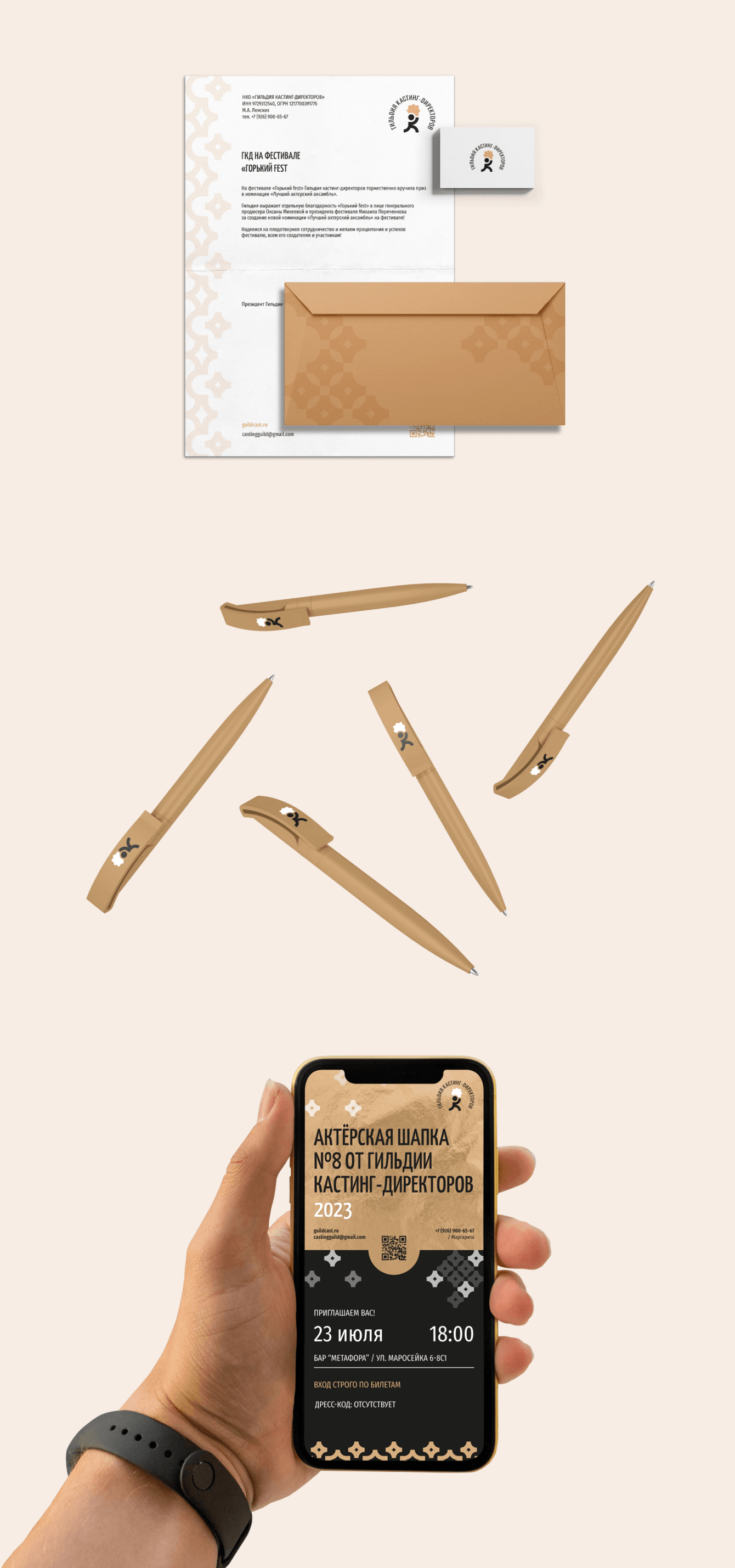 Был разработан фирменный стиль, отражающий суть деятельности Гильдии кастинг-директоров России. Логотип в форме фигуры с пазлом символизирует поиск талантов, а паттерны со звездами подчеркивают идею открытия "звезд". Современная визуальная система объединяет строгость и динамичность, усиливая узнаваемость Гильдии и делая ее коммуникации более профессиональными и выразительными.