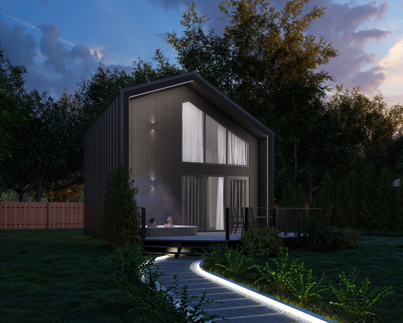 Разработана серия модульных домов в стиле современный "Барнхаус", объединяющая скандинавский минимализм и эко-эстетику. Три варианта вместимости (2/4/6 гостей) с единой дизайн-концепцией, адаптированной под лесной ландшафт.