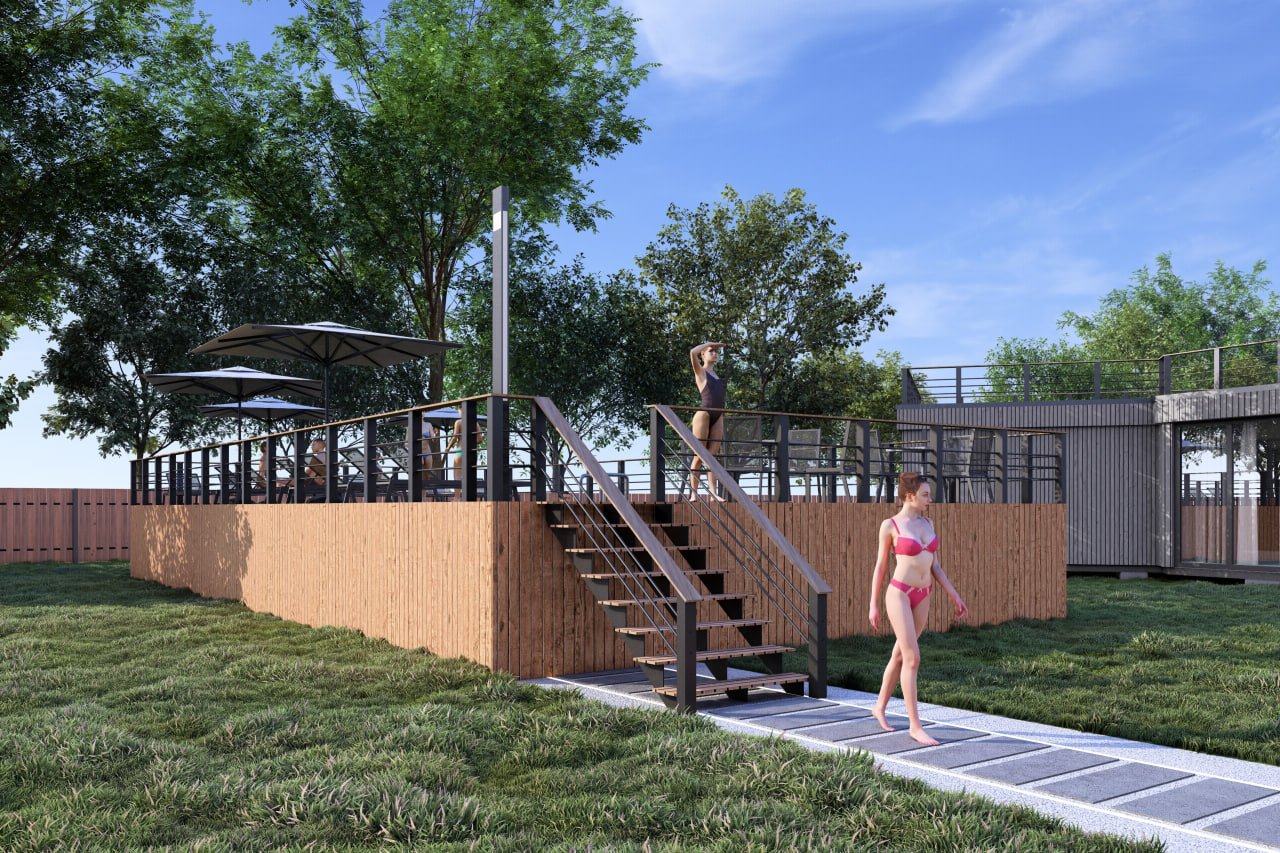Визуализация передает атмосферу уюта и единения с природой – от игры пара в лучах закатного света до тактильной текстуры древесины.