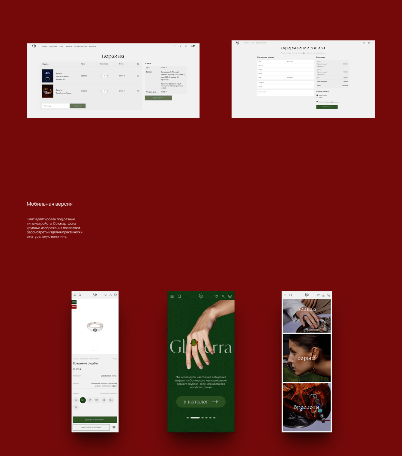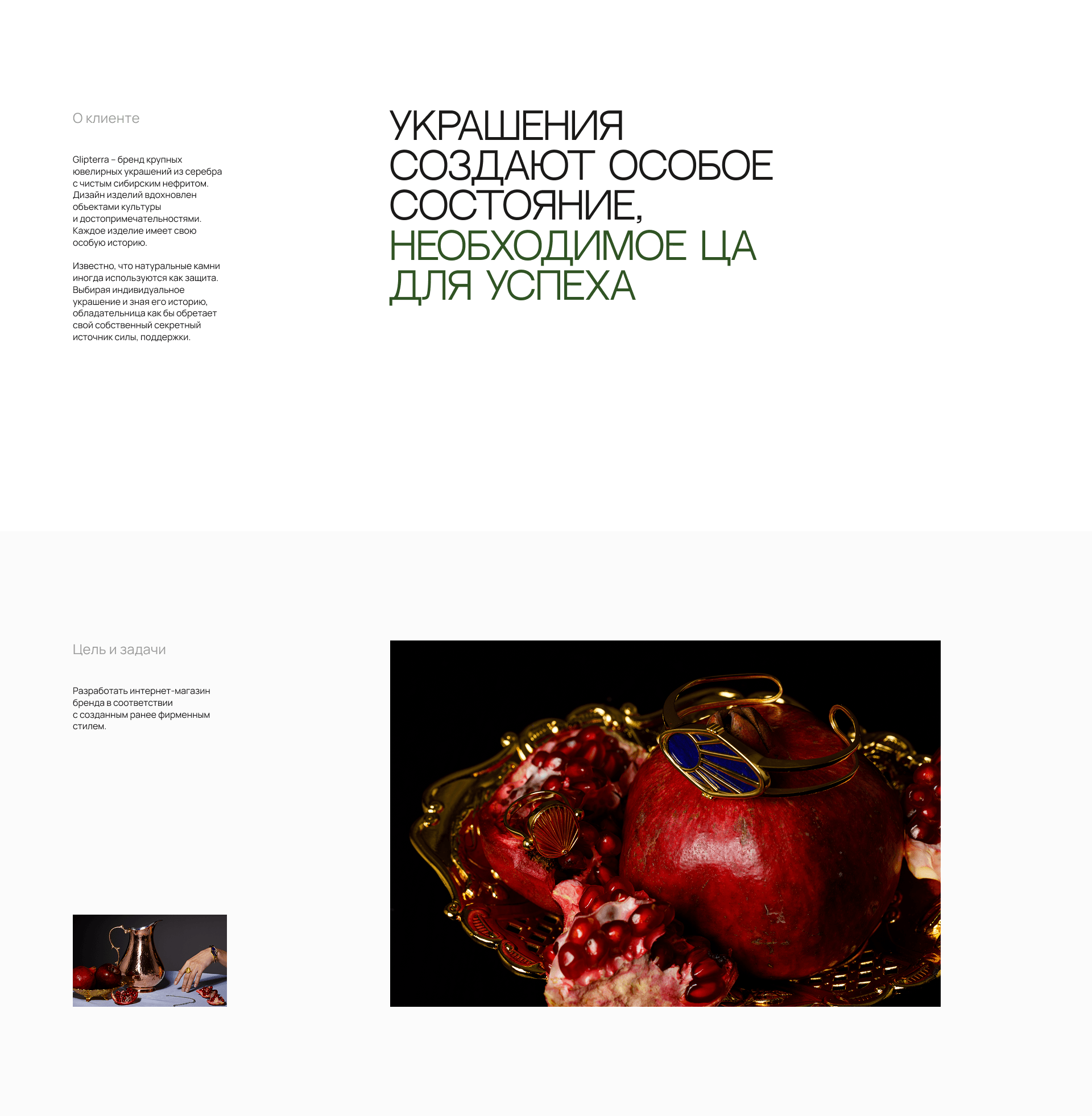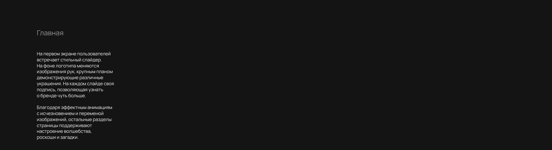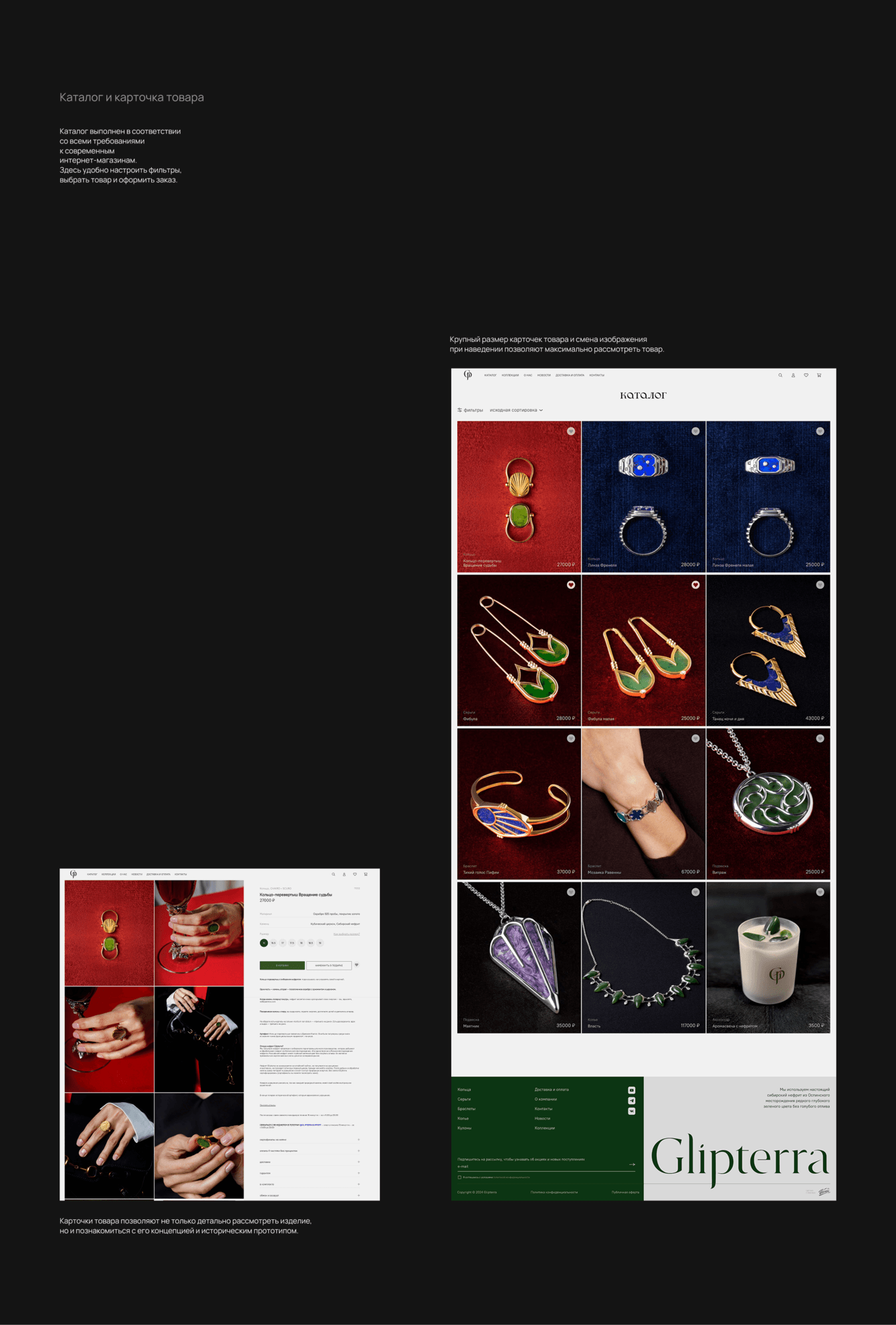 Мы разработали удобный стильный сайт, подчеркивающий уникальность Glipterra. Крупные изображения позволяют клиентам вдохновиться необычными украшениями, а продуманная структура интернет-магазина — легко найти всю информацию об интересующем изделии и оформить заказ.