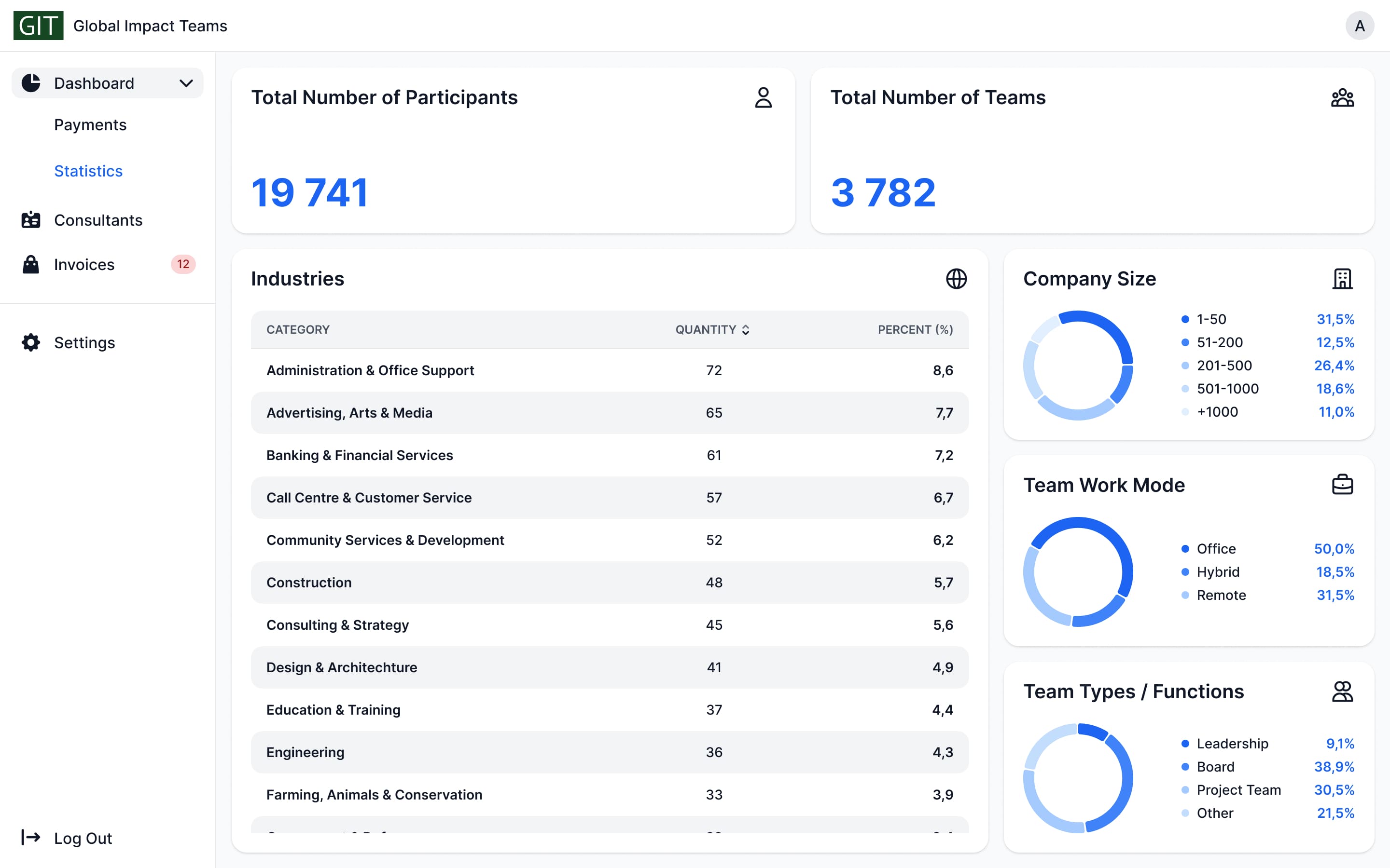 Раздел "Статистика" предоставляет информацию о том, сколько человек прошло оценку и какие отрасли проявляют наибольший интерес к тестированию. Здесь можно ознакомиться с полной статистикой по командам, что позволяет эффективно отслеживать их прогресс и анализировать результаты.