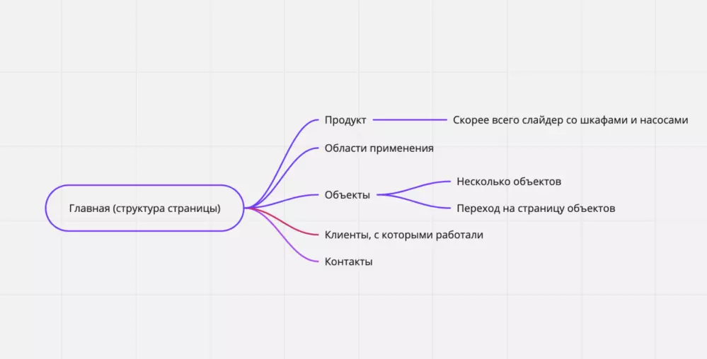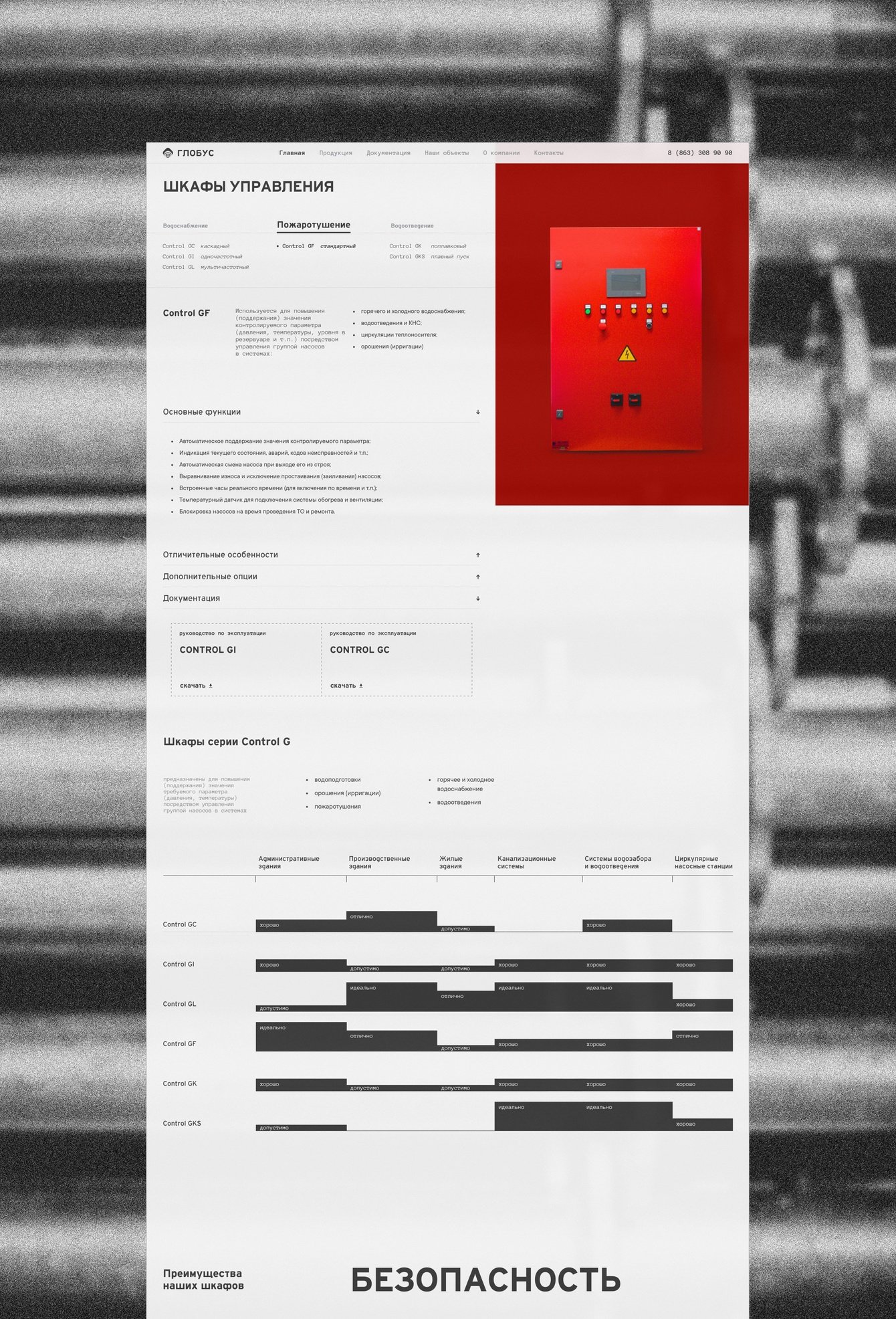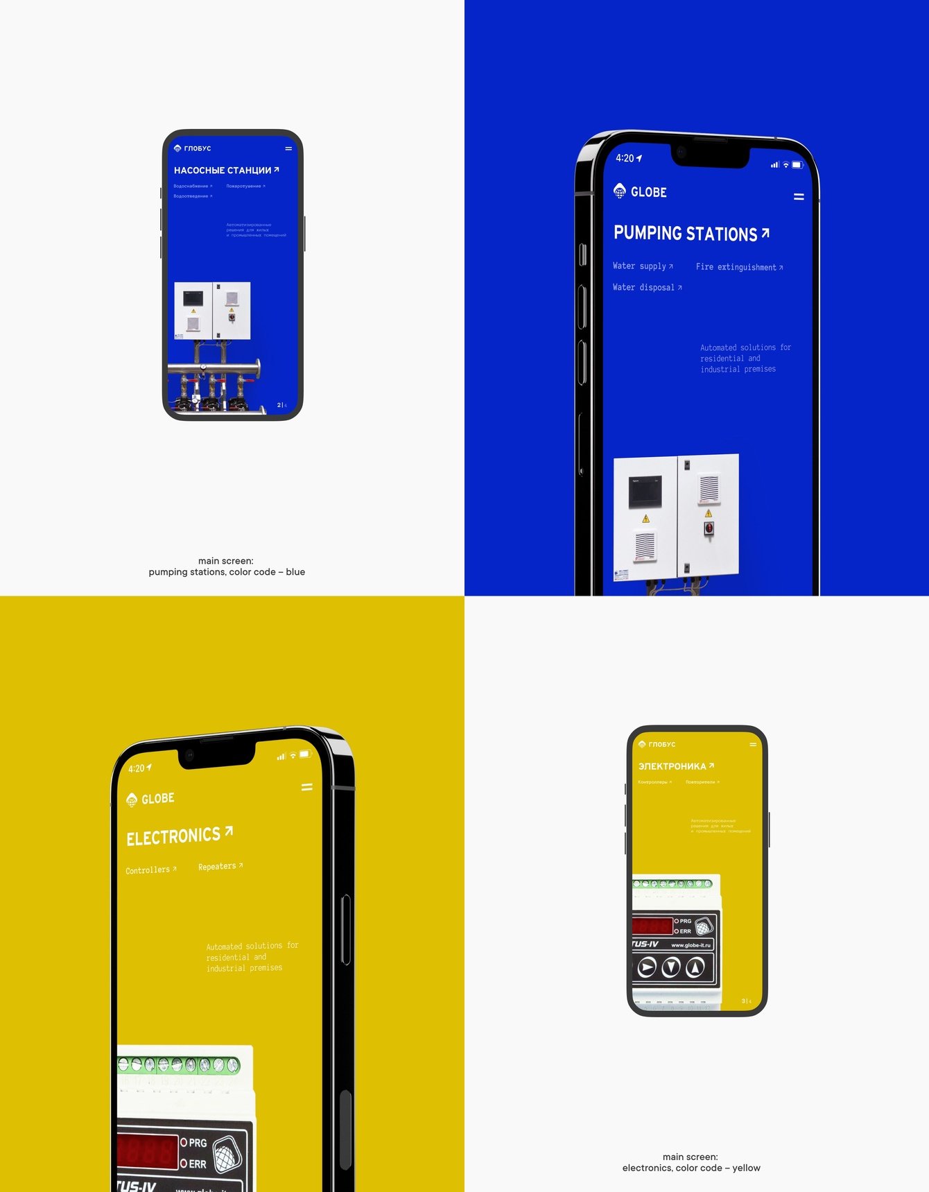 Первый экран демонстрирует все 4 основные направления компании: насосные установки, насосные станции, шкафы управления, блок контейнеры. Каждое из направлений имеет свой цвет для идентификации на сайте. При скролле сайта, пользователь знакомиться со всеми сферами деятельности компании. Ну а далее экраны, "наши объекты", "отзывы", "фото работ" и footer.
