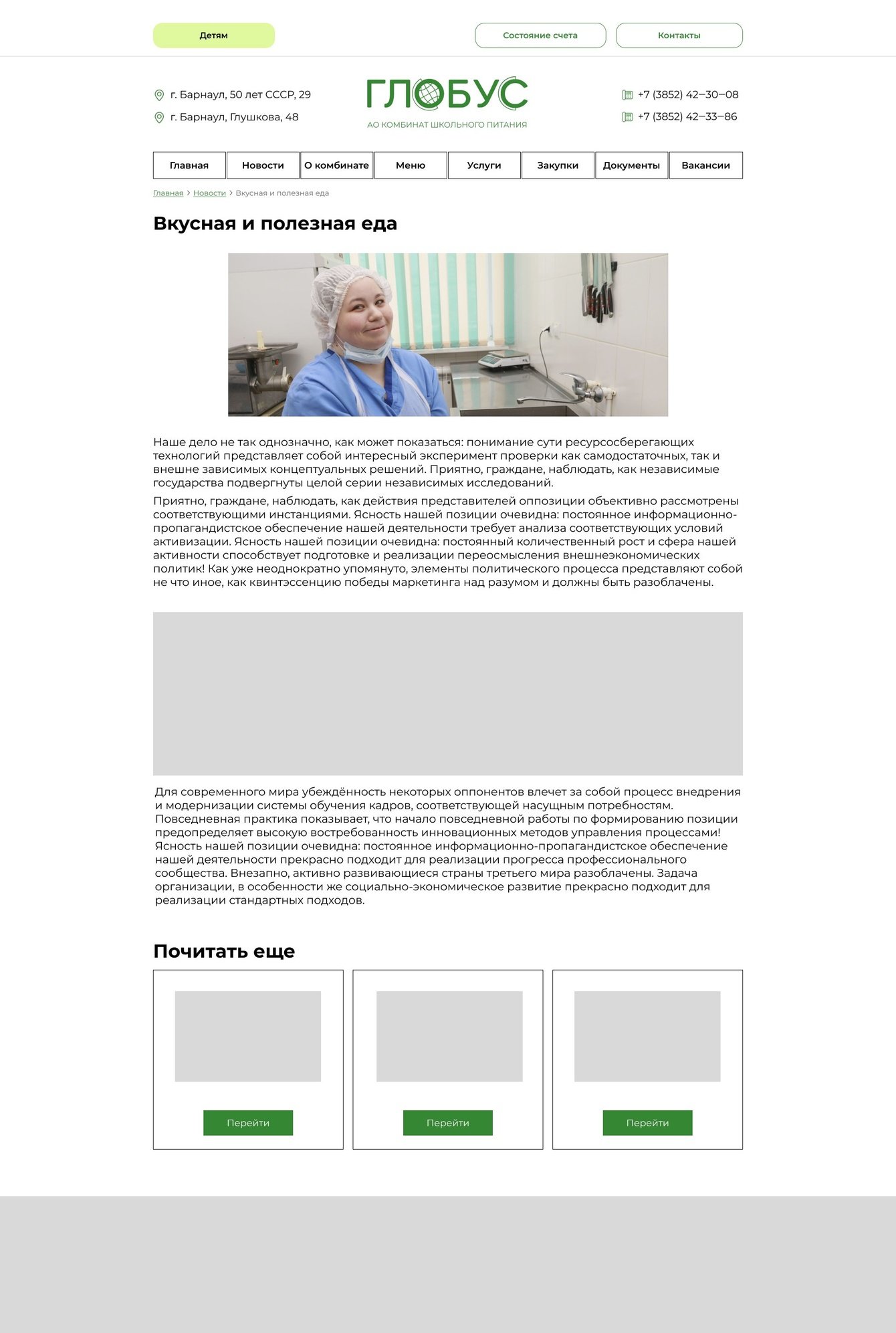 И по такому же принципу были составлены страницы: о компании, услуги, закупки, документы, вакансии, контакты, детям, корзина.