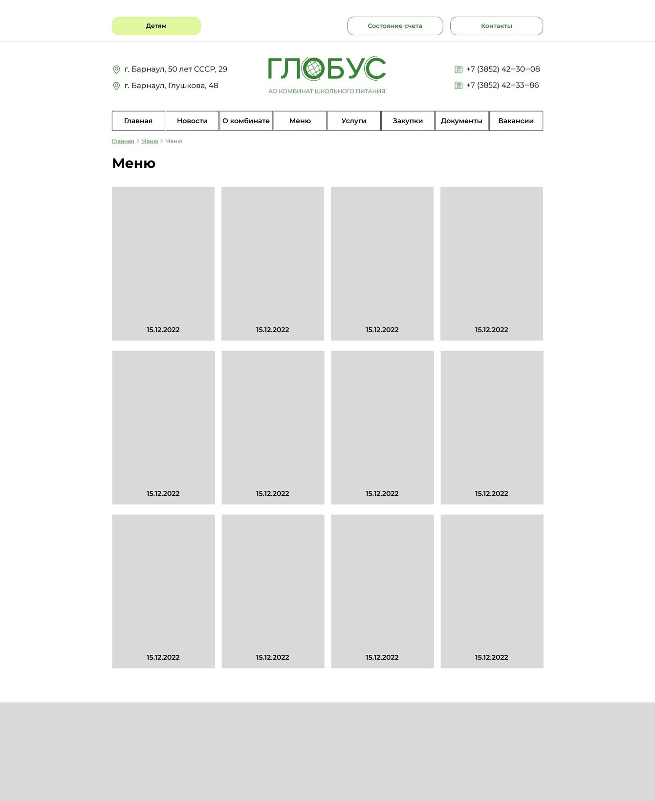 С самого начала клиент предупредил нас, что первая версия сайта будет очень упрощенной, поскольку нужно было своевременно, до начала учебного года, опубликовать информацию о комбинате, предлагаемом меню и всех нормативных документах, касающихся приготовления блюд. Далее планировалось добавление каталога, корзины и функционала оплаты.