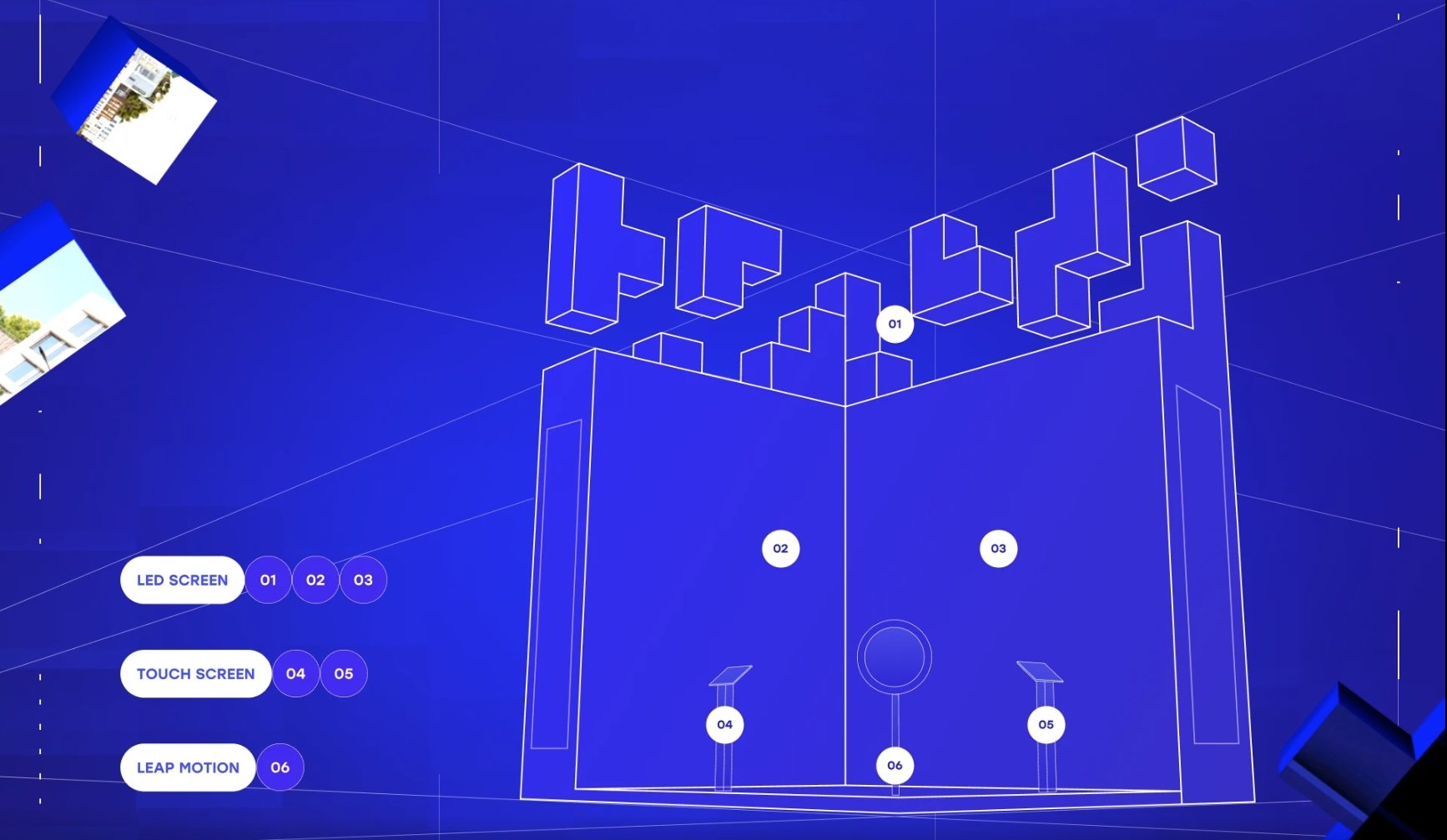 Основа визуальной концепции заключалась в синтезе физического и цифрового мира. Нижняя часть стенда представляла собой монолитную конструкцию, а экраны сверху создавали иллюзию распадающихся пикселей, символизируя строительство цифрового пространства.